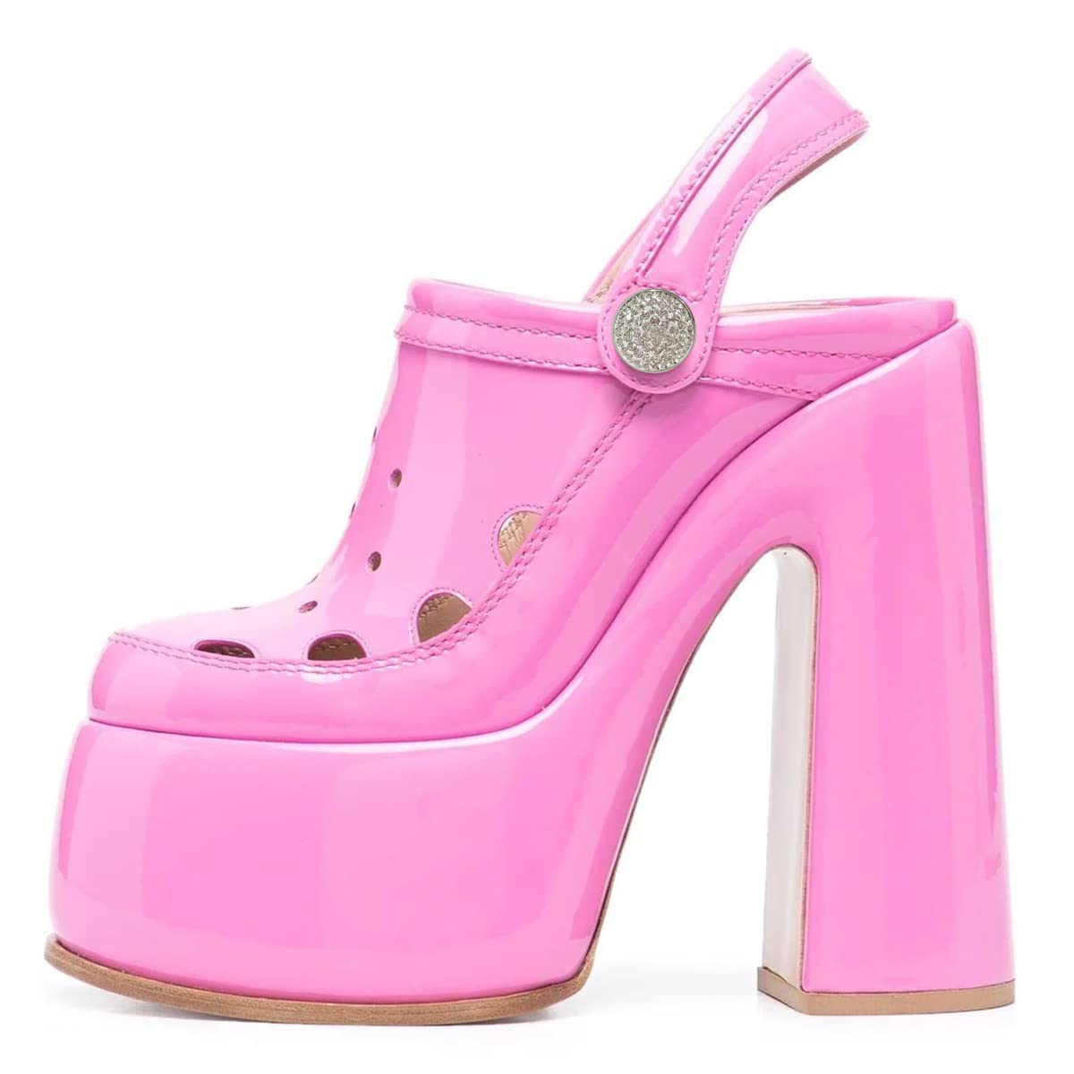 Special Designs: Pink Mary Janes with a classic block heel, cut-out design, rhinestoen embellishment and slingback design