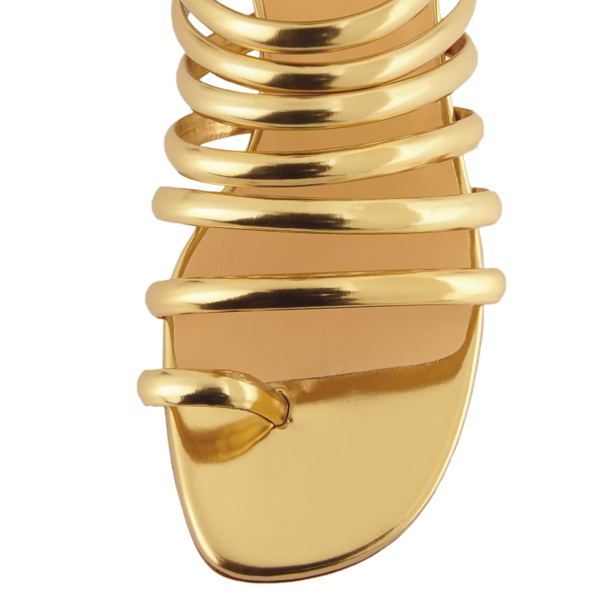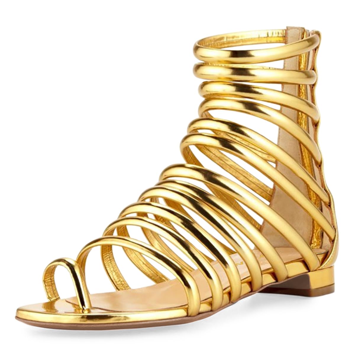 Special Designs: Gold flat sandals with multiple strappy designs and back-zip closures.