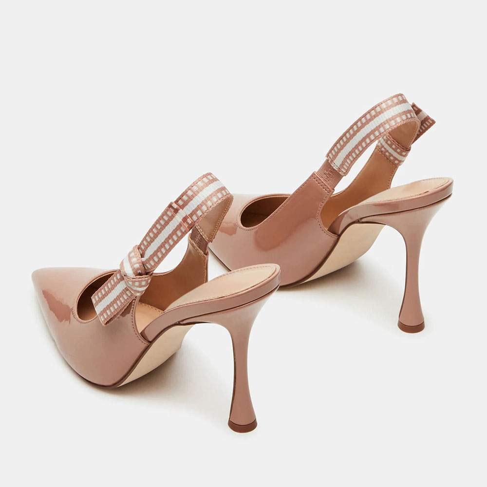 Special Designs: The nude patent leather slingback pumps feature a pointed toe, a slender stiletto heel, and a slingback strap with a bow accent.