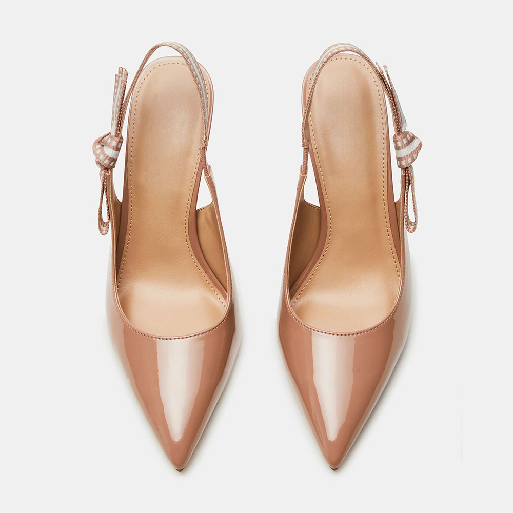 Patent Leather Stiletto Heel Slingback Bow Accent Nude Pumps