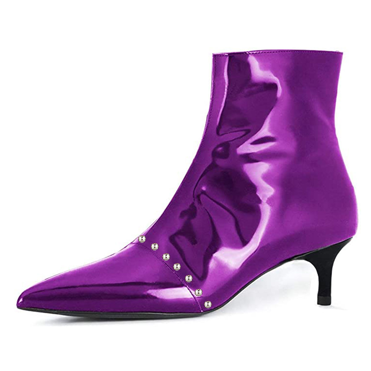 Patent Leather Studded Pointed Toe Kitten Heeled Booties in Purple