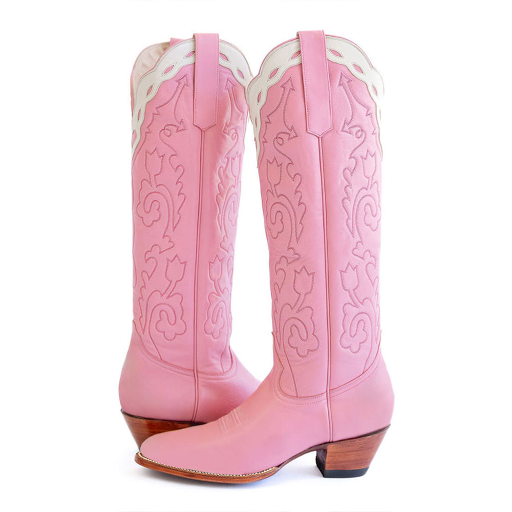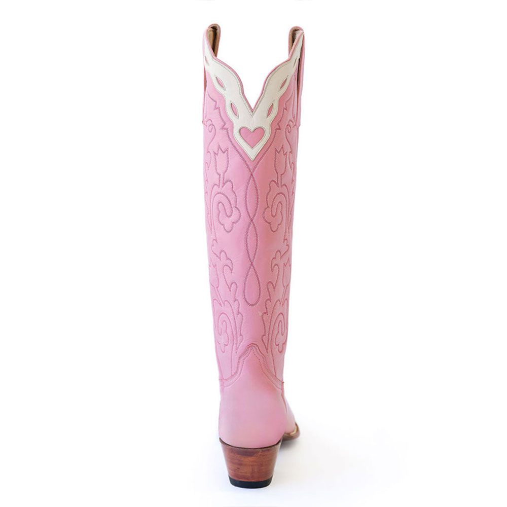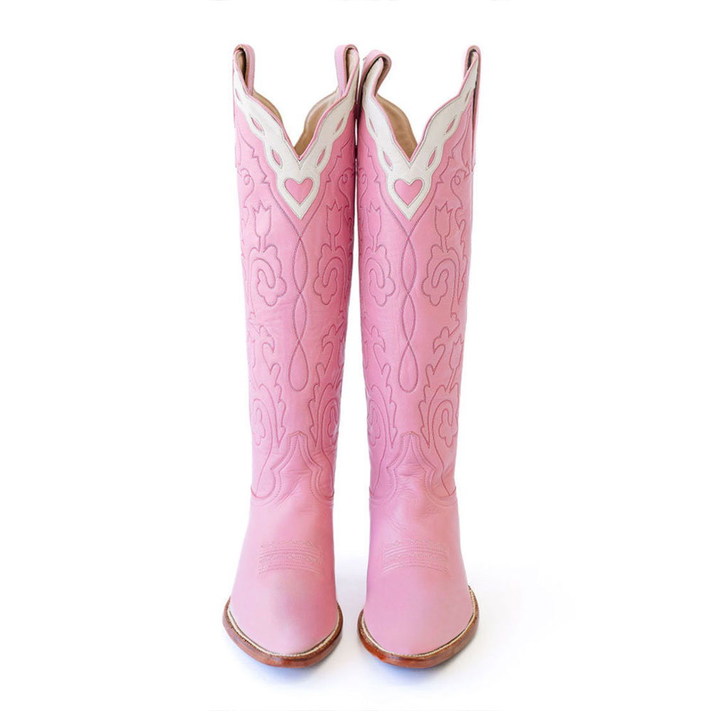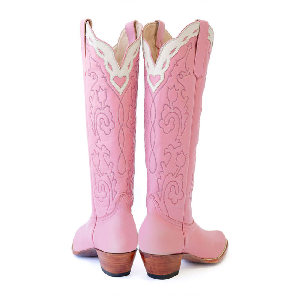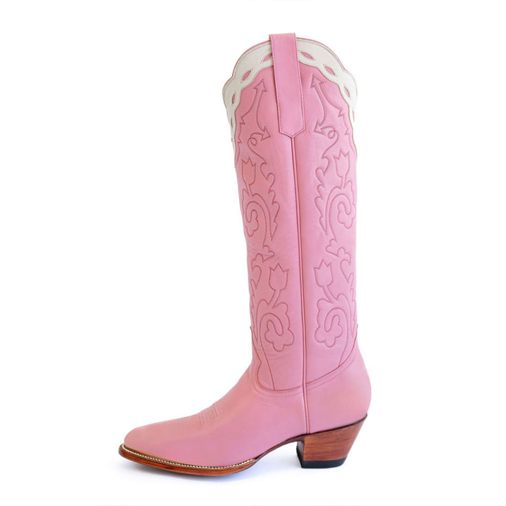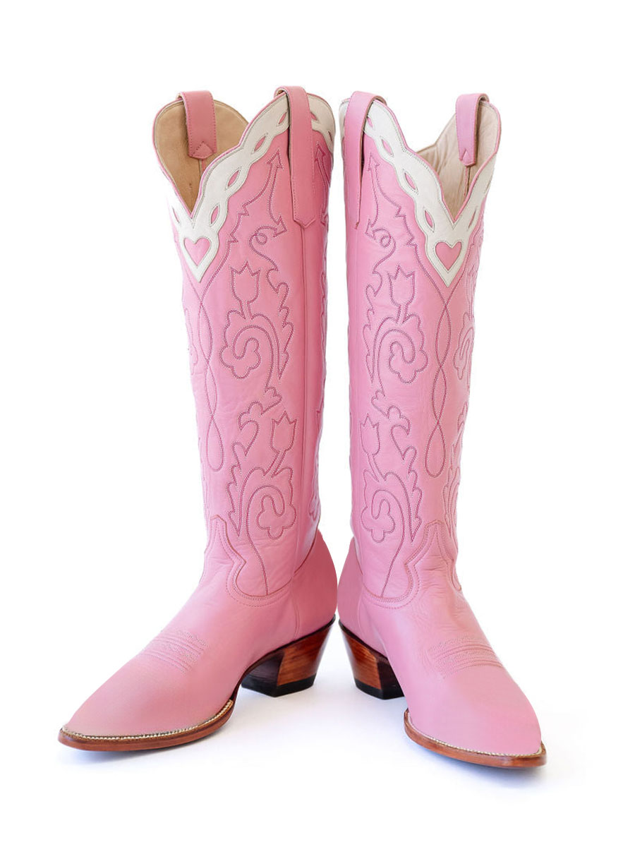 Pink Almond Toe Chunky Heel Stitching Knee High Cowboy Boots for Women