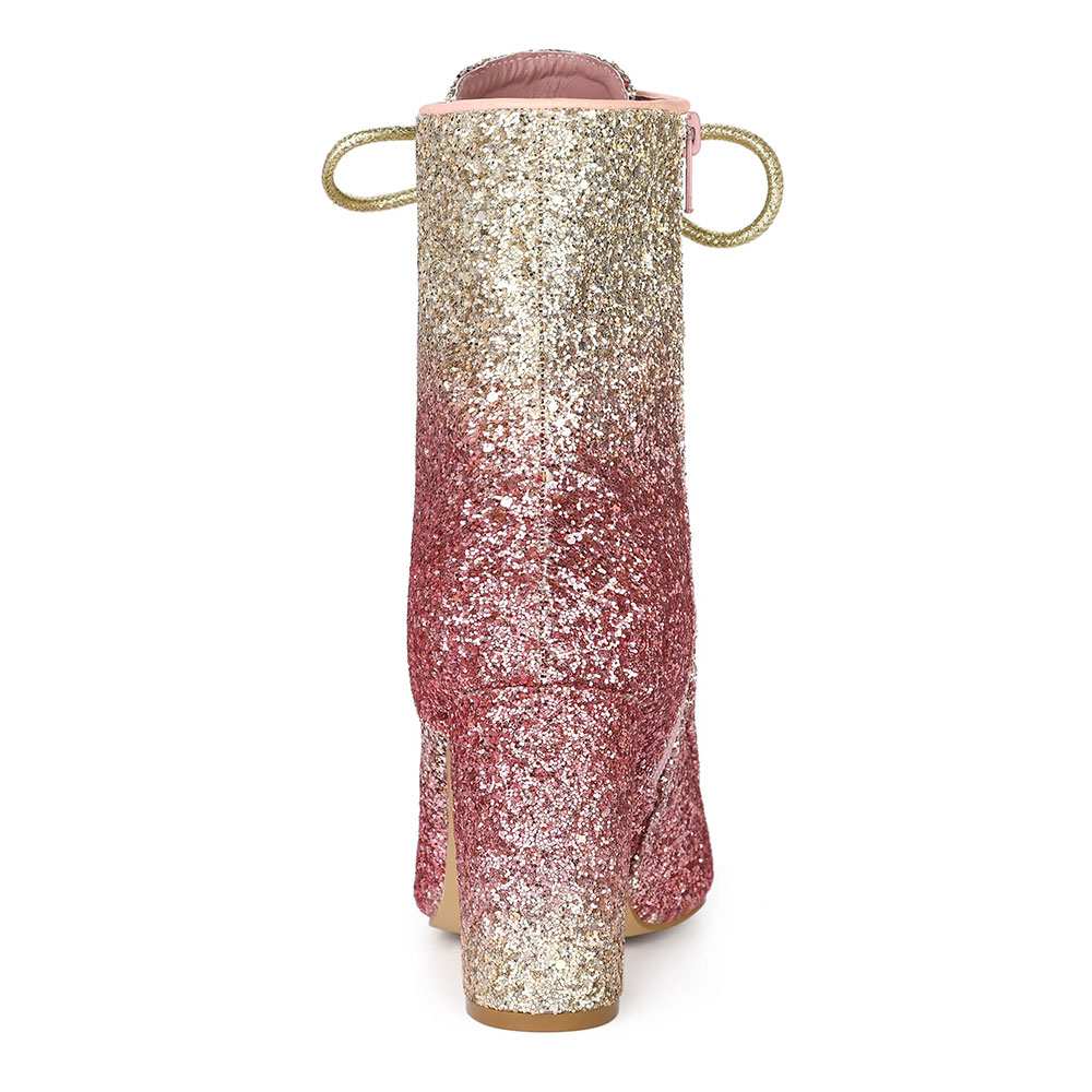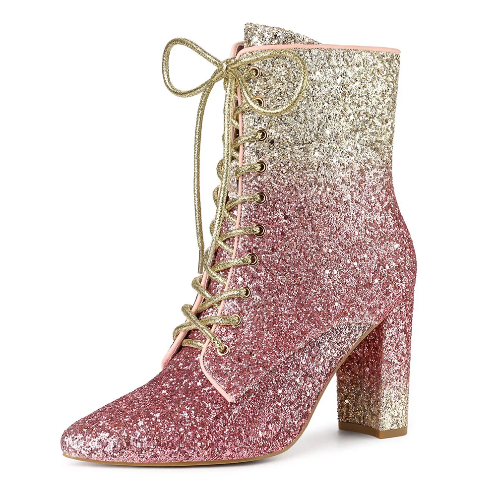 Pink & Gold Pointed Toe Chunky Heel Side Zip Lace Up Booties for Women
