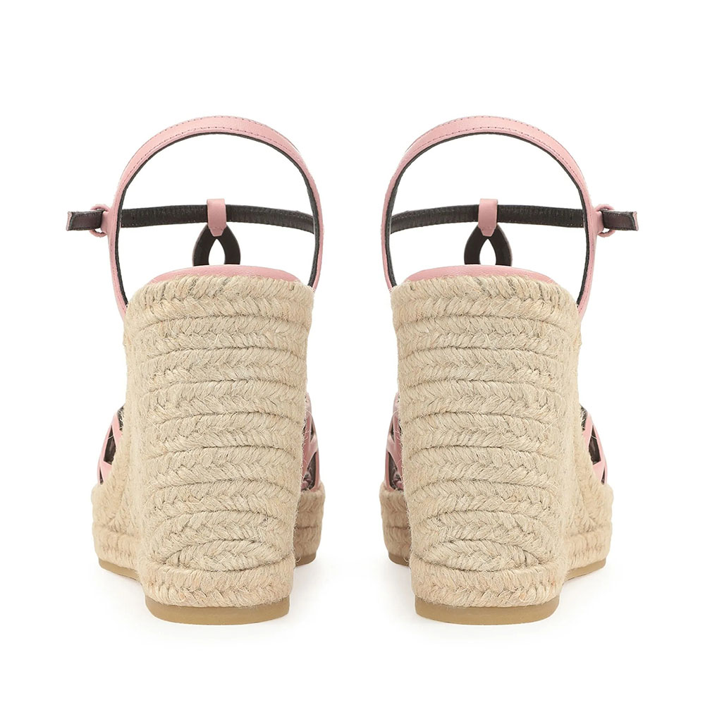 Special Designs: These pink wedge sandals feature a cut-out faux leather upper, an ankle strap with a buckle, and a bold platform.