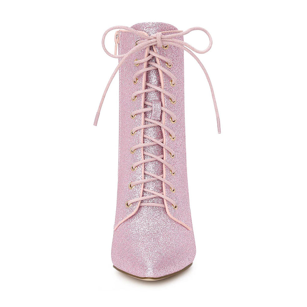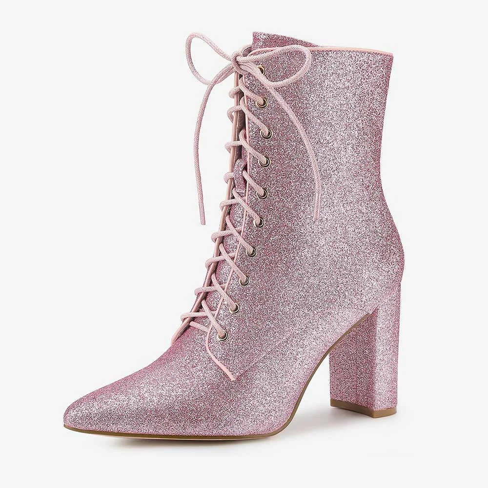 Pink Pointed Toe Side Zipper Lace Up Booties for Women with Glitter