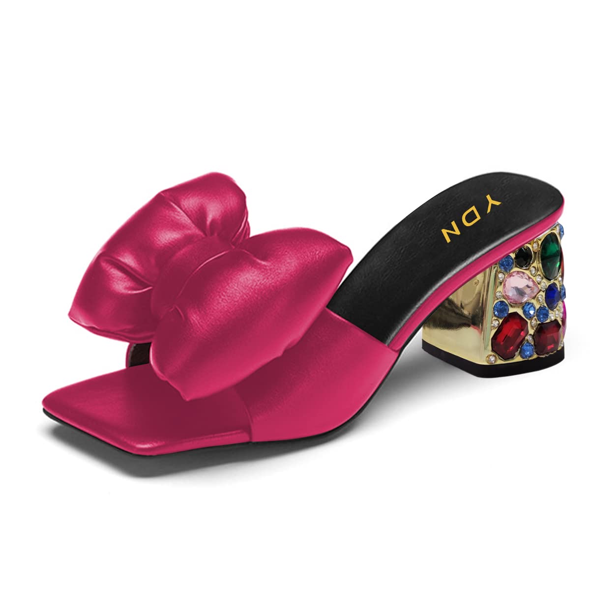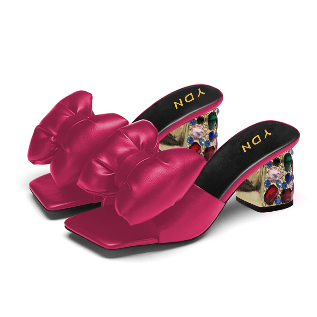 Pink Satin Square Toe Bow Rhinestone Embellished Block Heel Mules