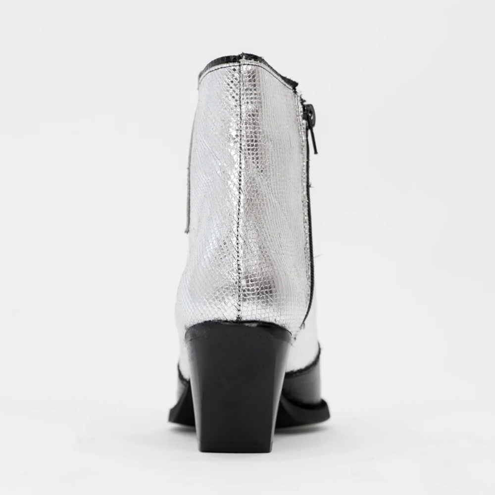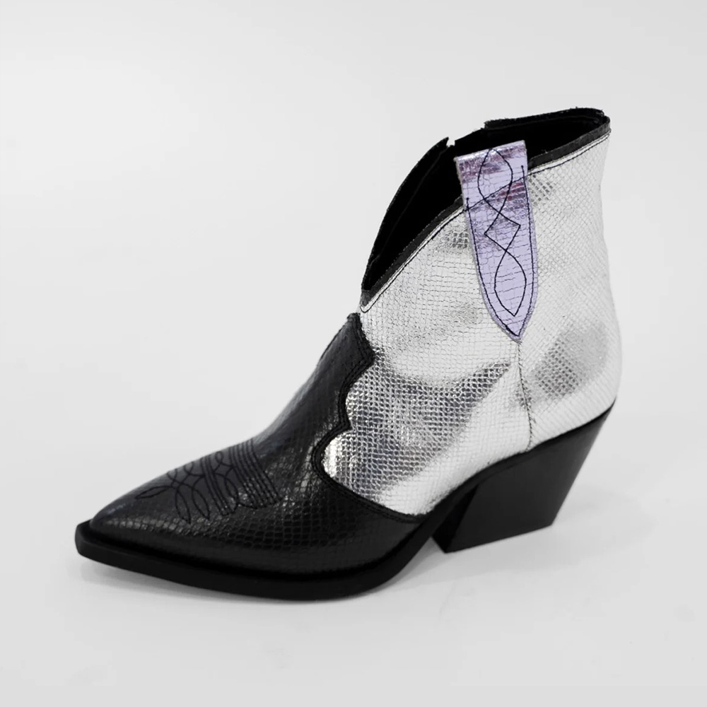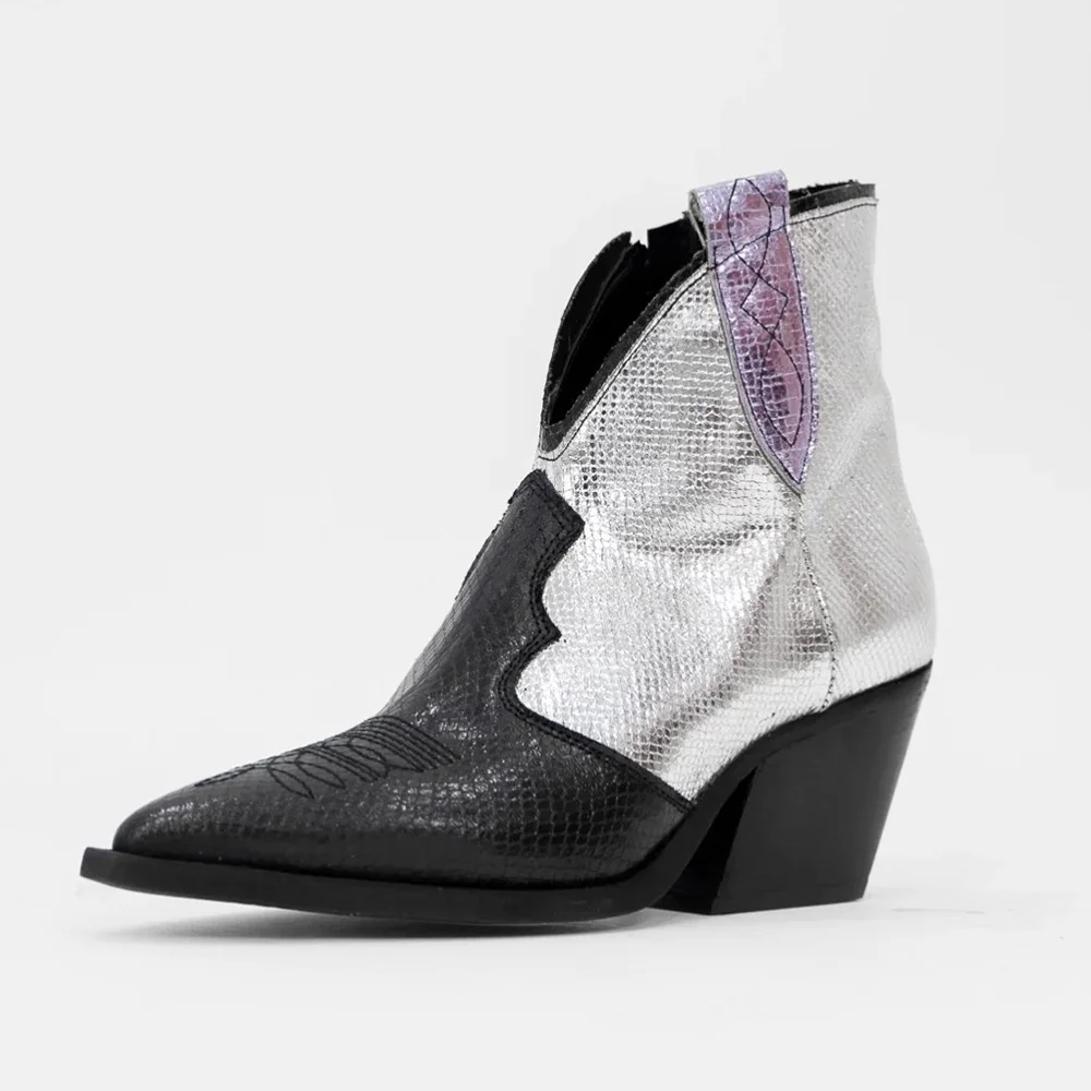Pointed Toe Block Heel Black & Metallic Silver Cowboy Boots for Women