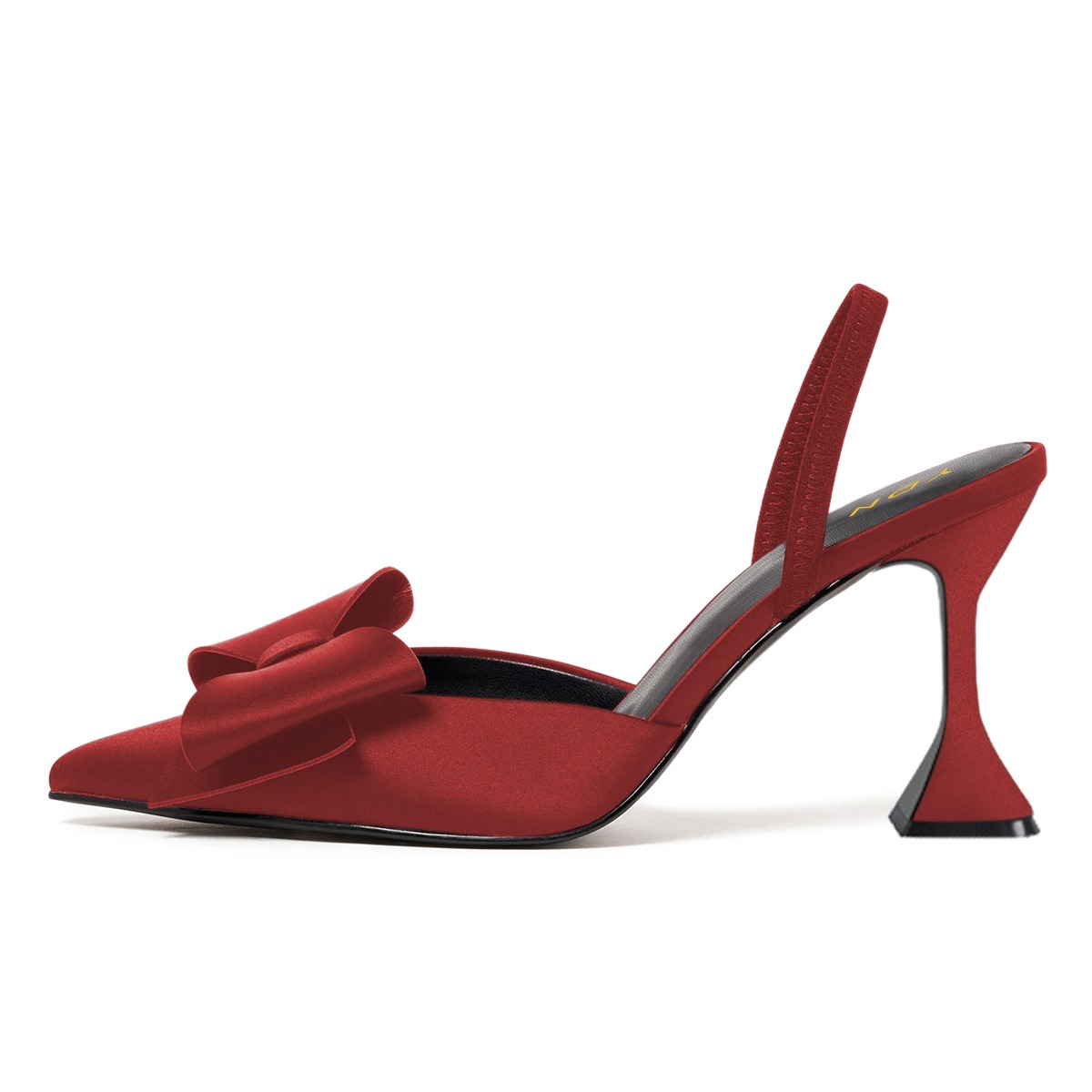 Pointed Toe Bow Decor Slingback Red Pumps with Flared Heels