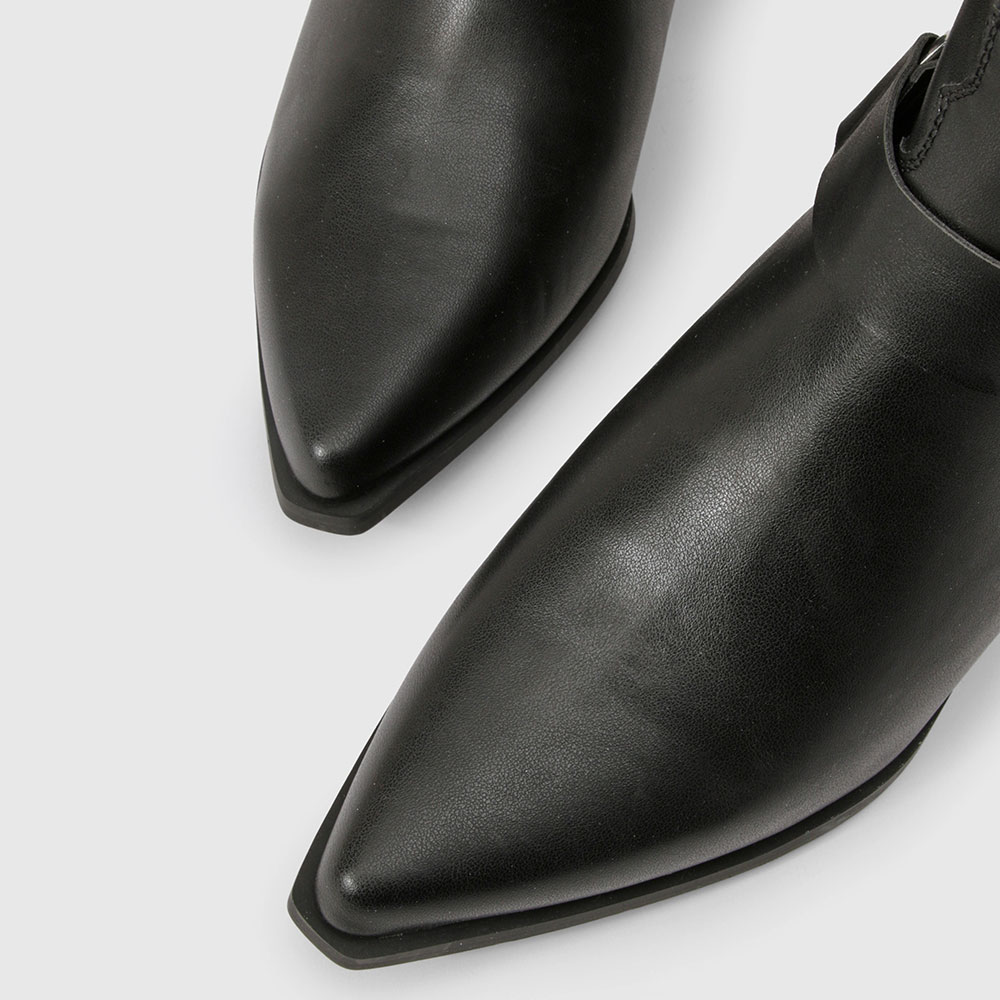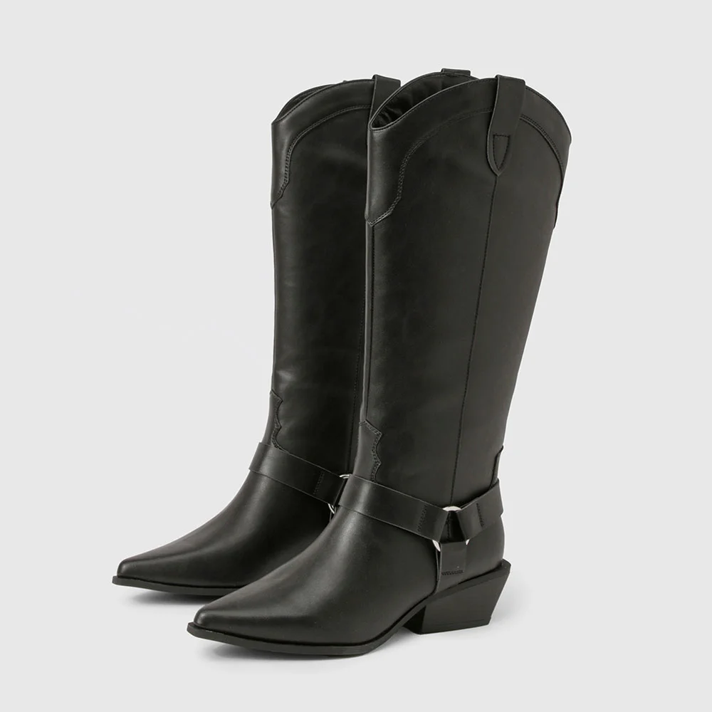 • Special Designs: The black knee-high cowgirl boots feature a pointed toe and chunky heel, detailed stitching, and a decorative strap around the ankle.