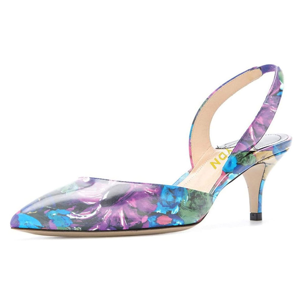 • Special Designs: Purple floral printed pumps featuring a classic kitten heel and a slingback pattern.