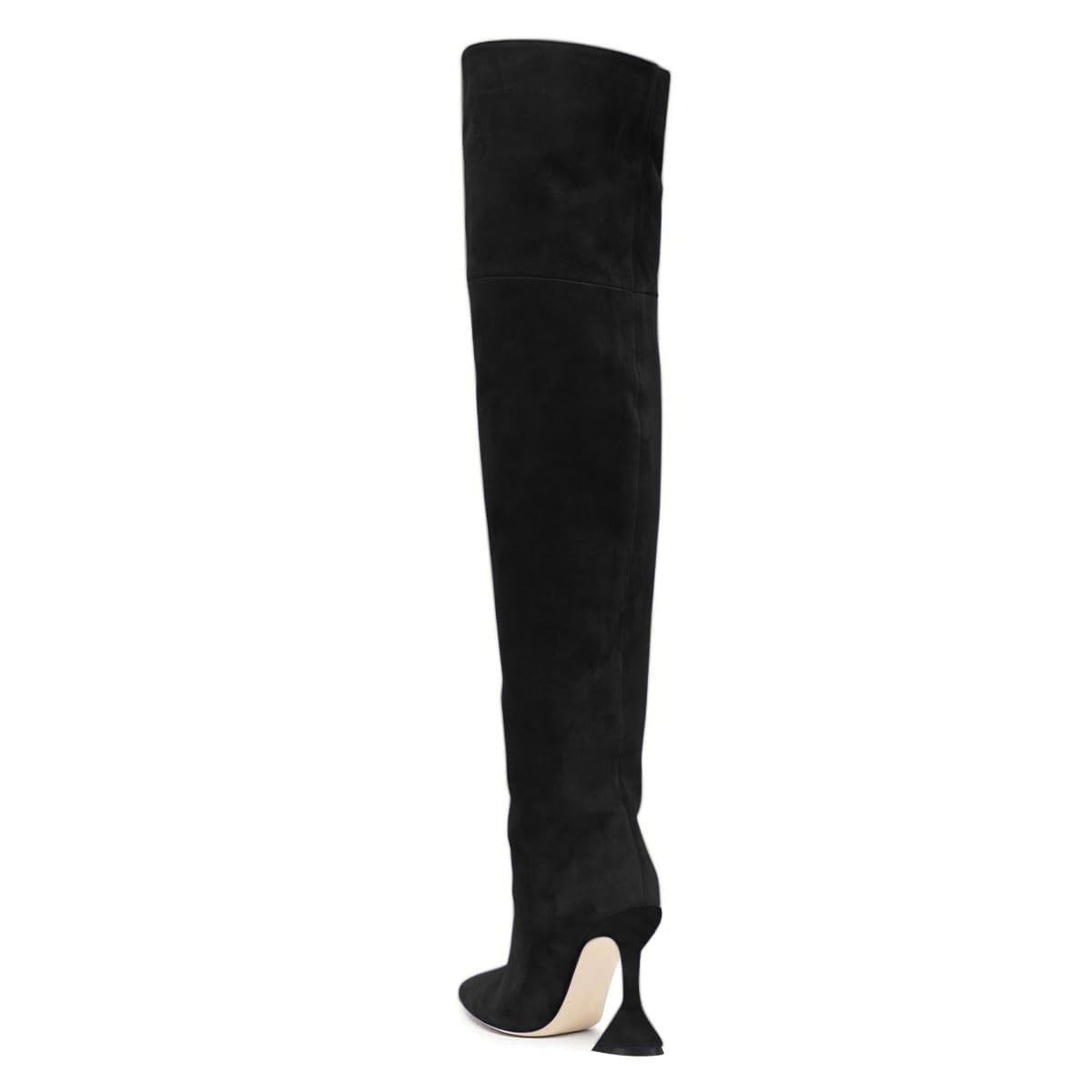 Pointed Toe Pull-On Flared Heel Over-The-Knee Boots in Black