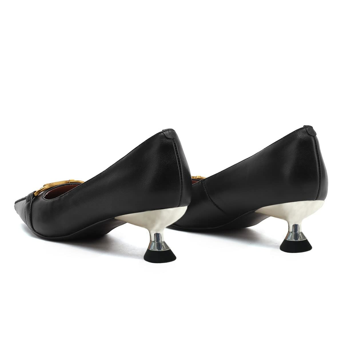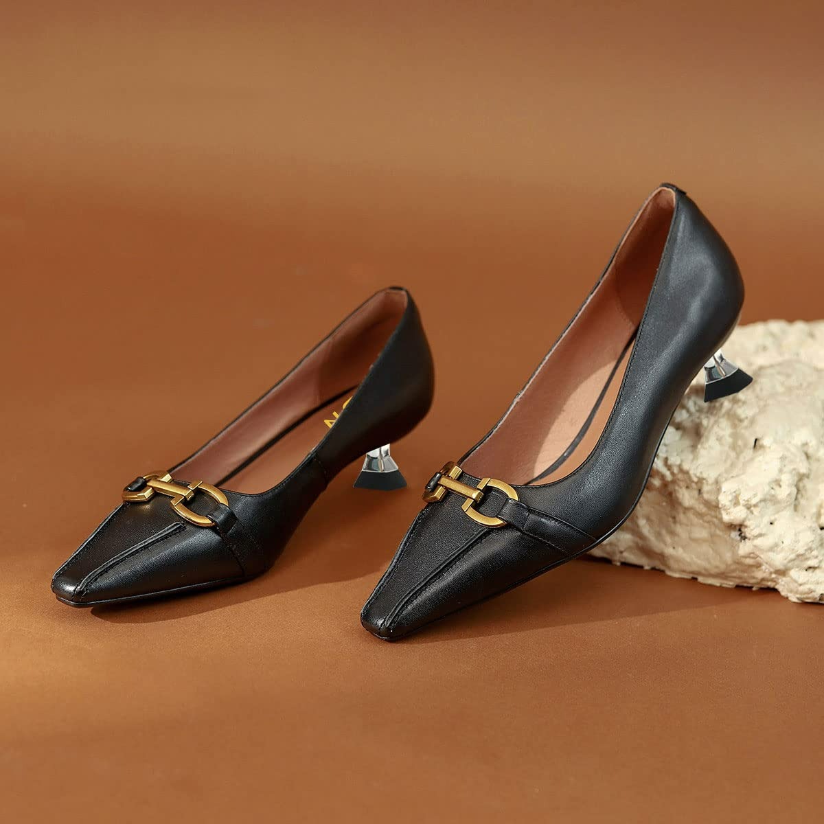 Special Designs: These pumps feature an elegant black color, a pointed toe, a horsebit, and a slip-on style.
