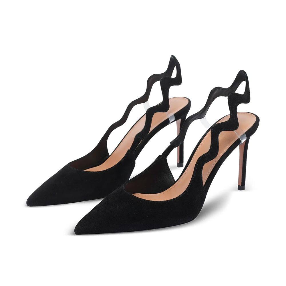 • Special Designs: The pumps feature a vegan suede upper, a pointed toe, a wavy slingback strap, a cut out design, and a slender stiletto heel.