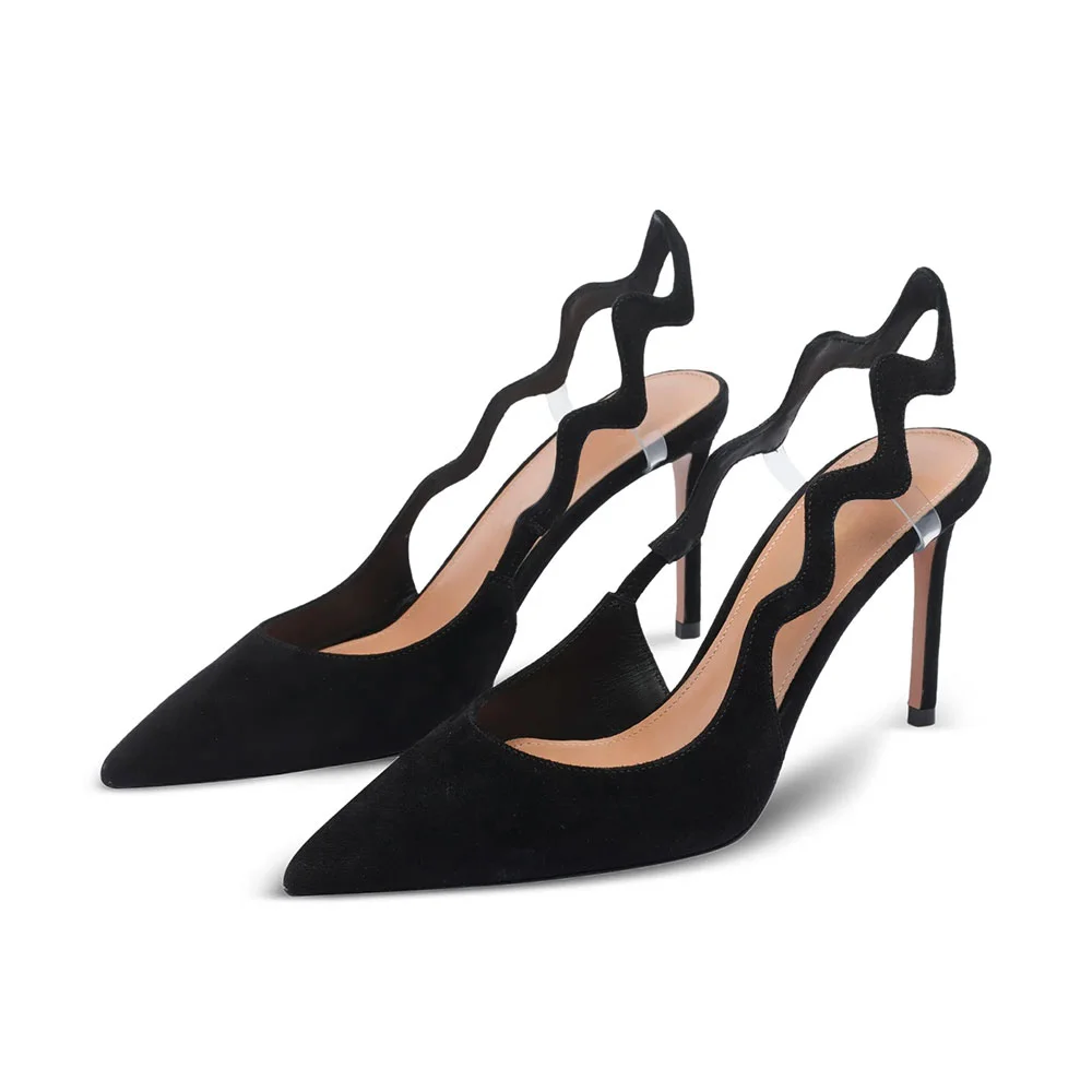 Pointed Toe Stiletto Heel Wave Slingback Strap Cut Out Black Pumps
