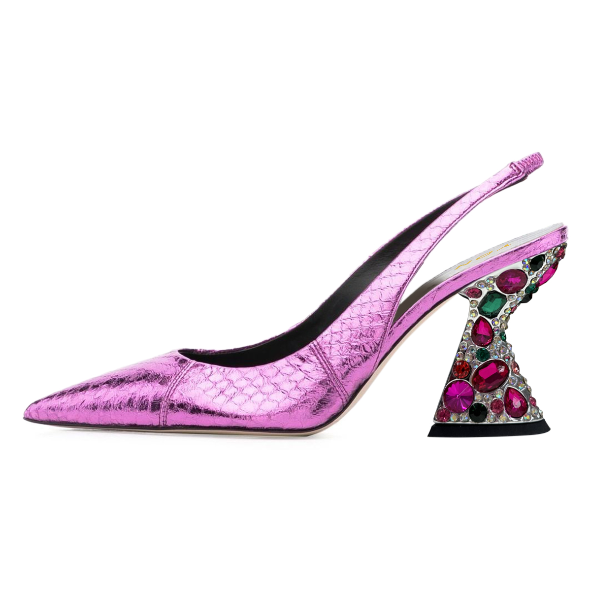 Special Designs: Purple croc-embossed pumps feature a rhinestoen embellished heel and a slingback design.