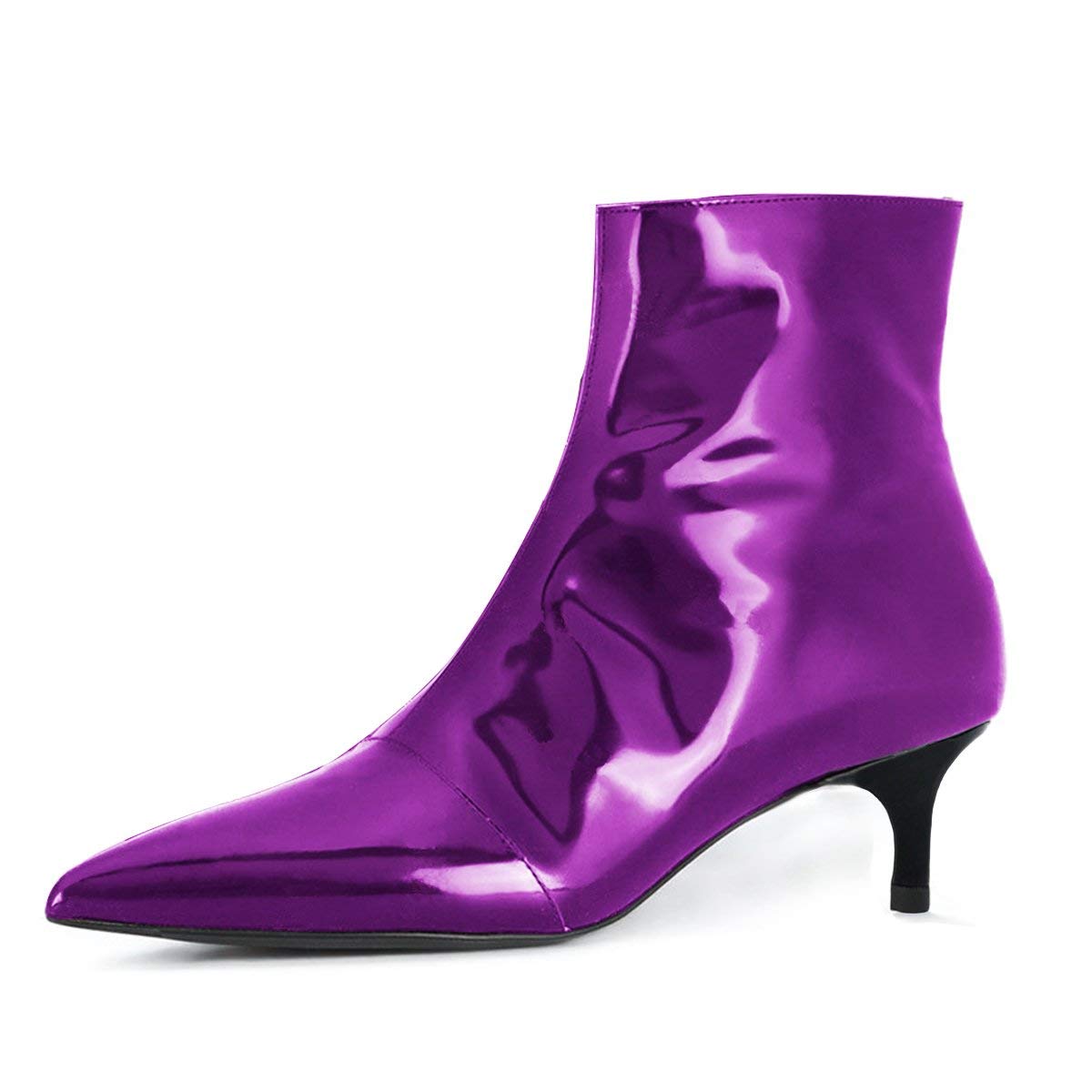Special Designs: Purple classy ankle boots featuring patent leather sophistication, side-zip closure and a classic kitten heel