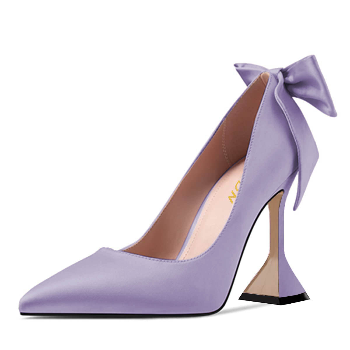 Purple Pearl Bow Pointed Toe Flared Heel Slip-On Pumps for Women