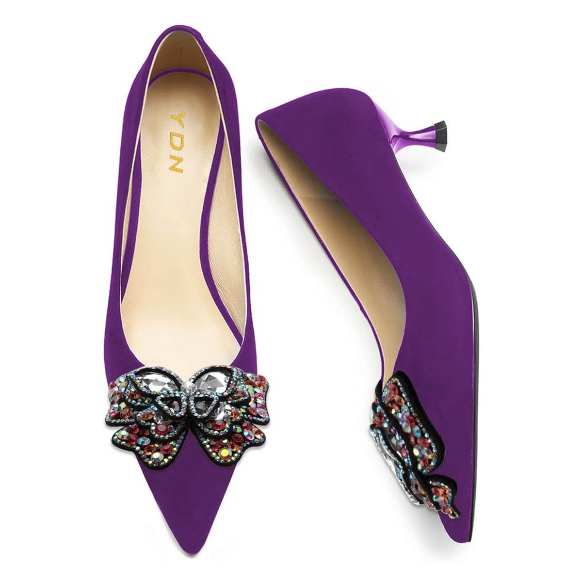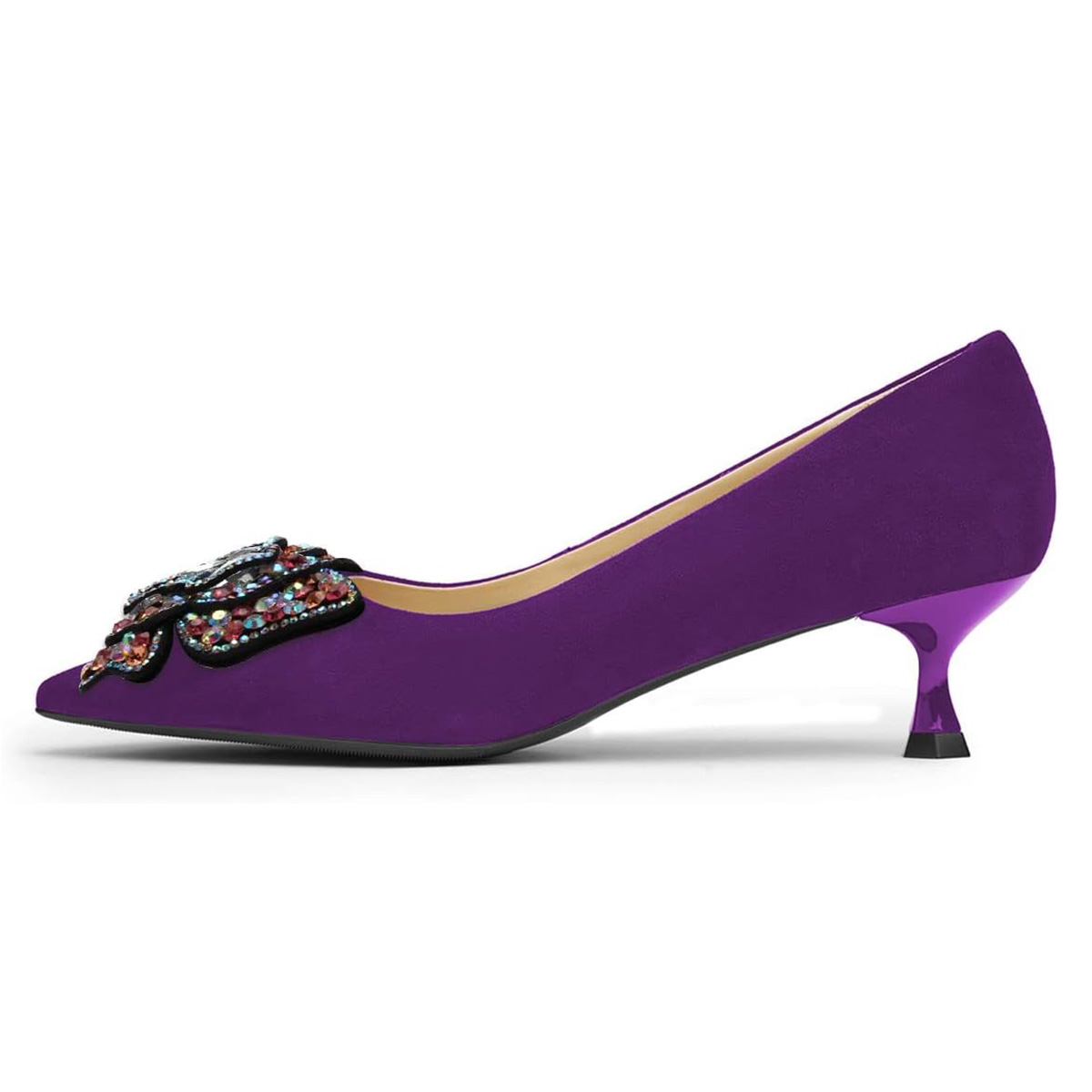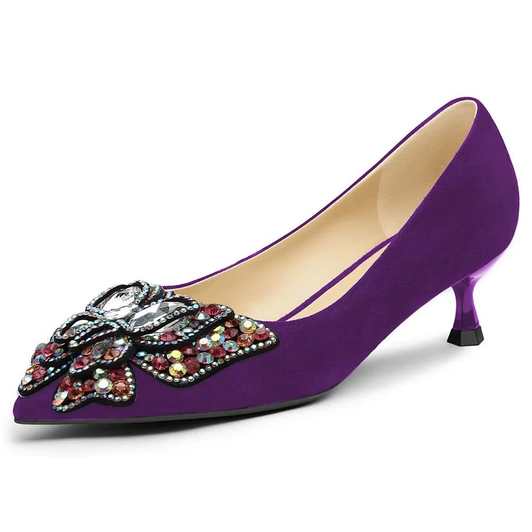 Purple Pointed Toe Rhinestone Butterfly Kitten Heel Pumps Shoes