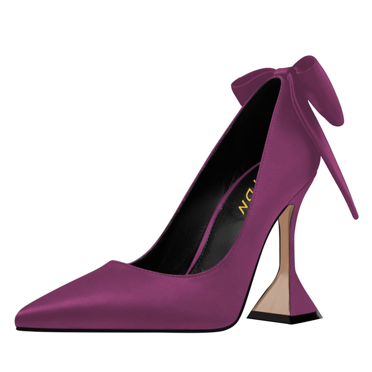 Purple Satin Pearl Bow Pointed Toe Pumps Shoes with Flared Heel