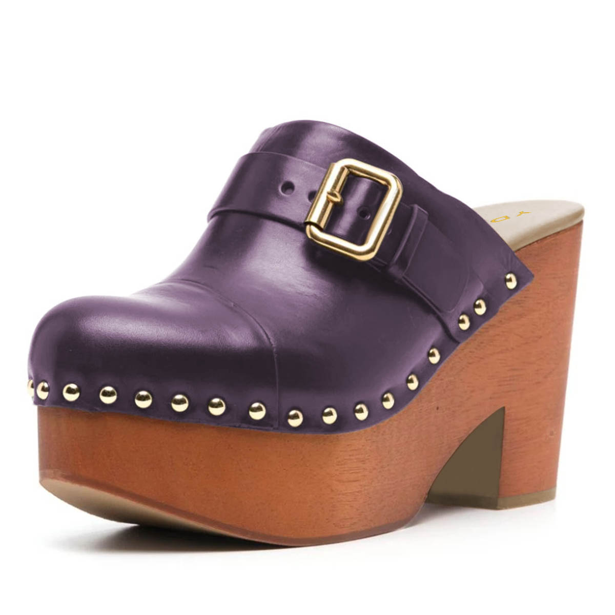 Purple Studs Buckle Strap Round Toe Block Heel Platform Mules Shoes