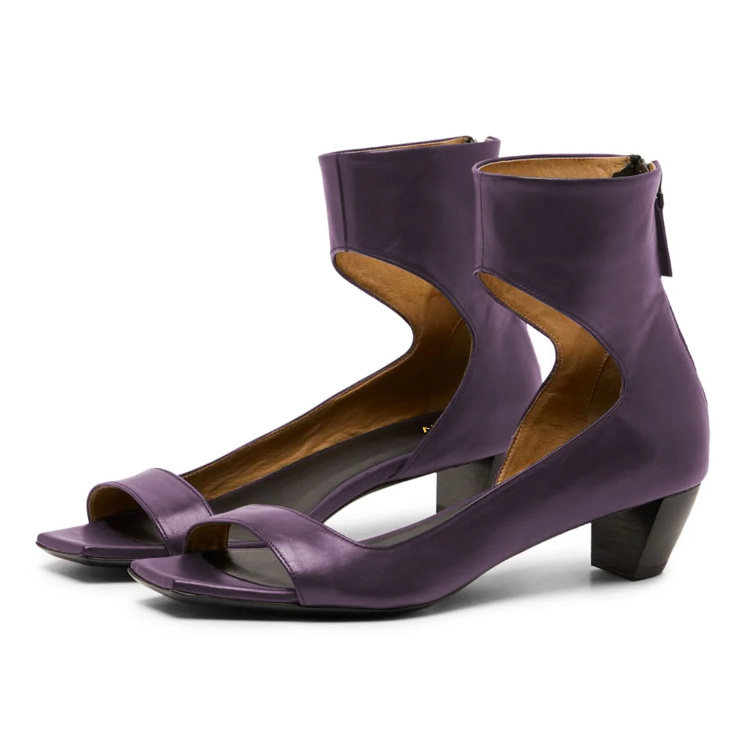Purple Vegan Leather Open-Toe Chunky Heel Zipper Sandals for Women