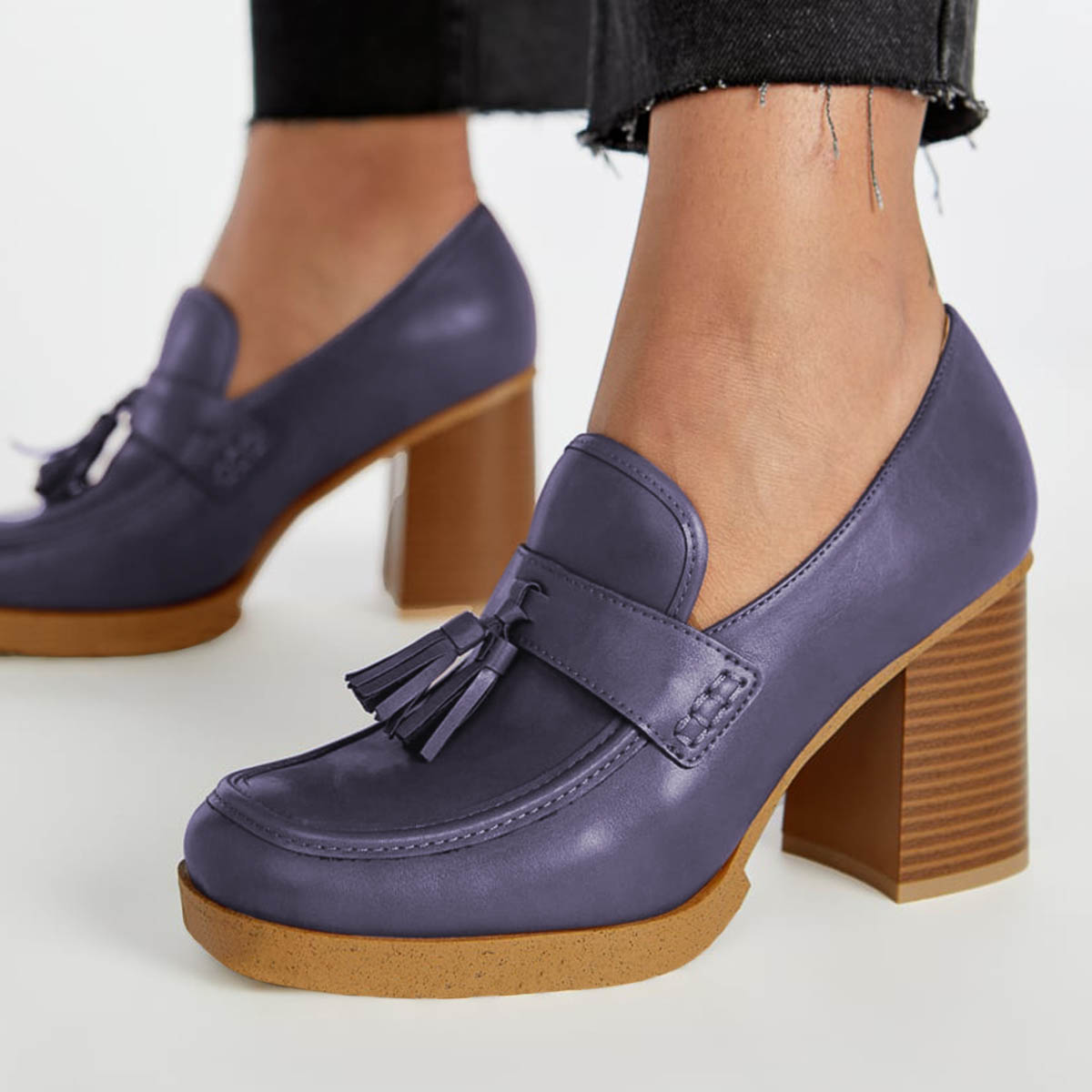 Purple Vegan Leather Tassel Accents Square Toe Loafer Heels
