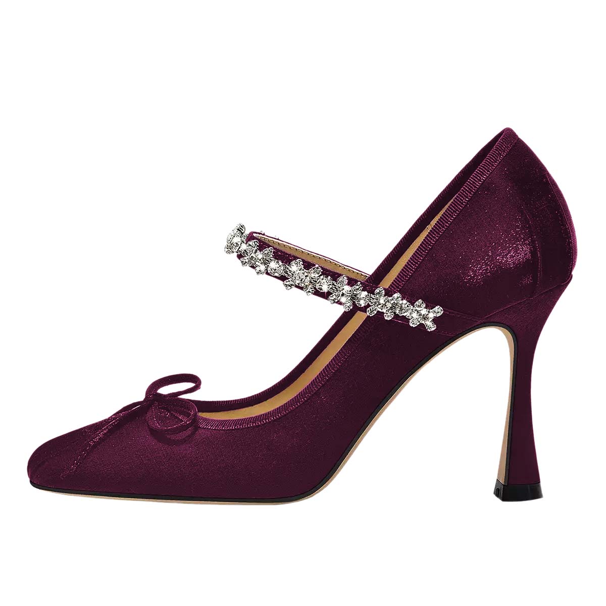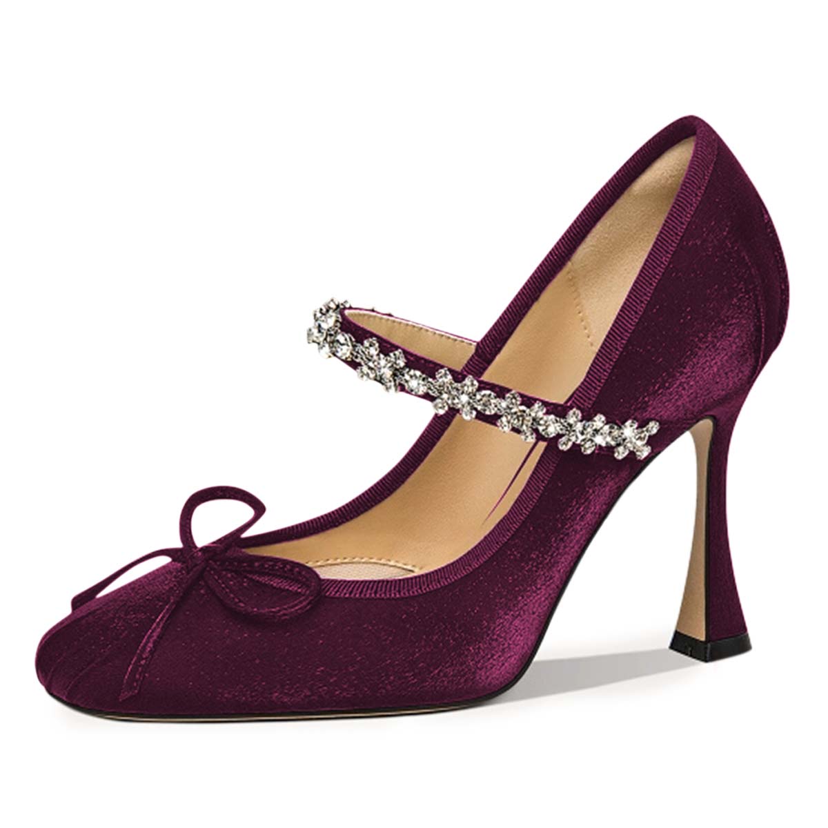 Special Designs: The velvet square-toe flared heel pumps feature a rhinestone strap and a tonal bow on the front.