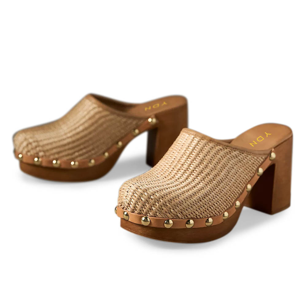 Raffia Round Toe Platform Studded Mules Shoes with Chunky Heel