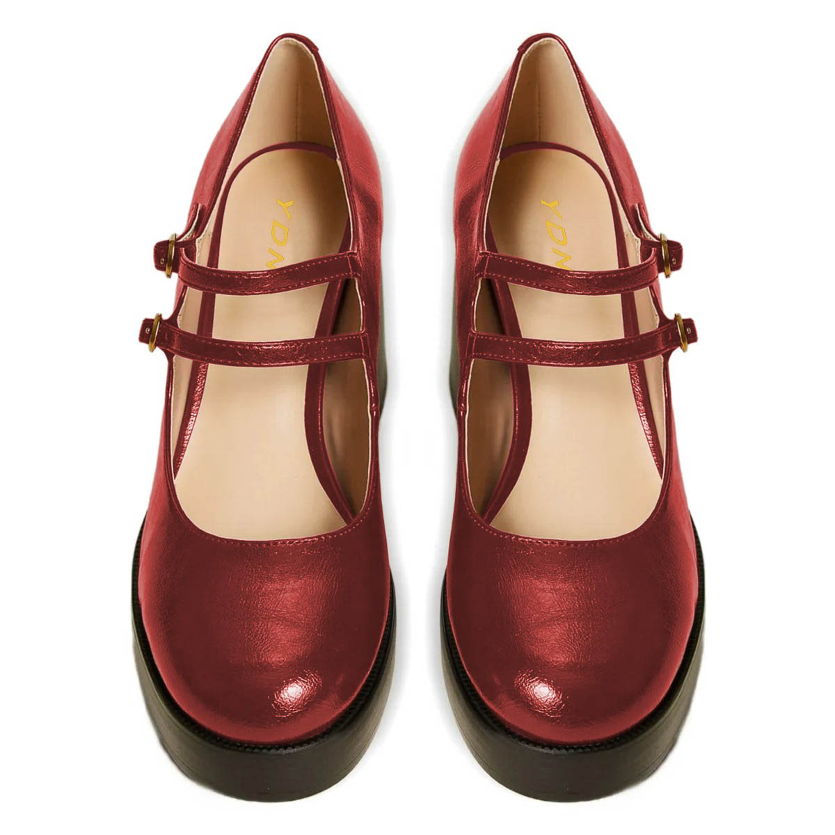 Special Designs: The red Mary Jane shoes feature double straps with gold-toned buckles, a chunky heel, and a bold platform.