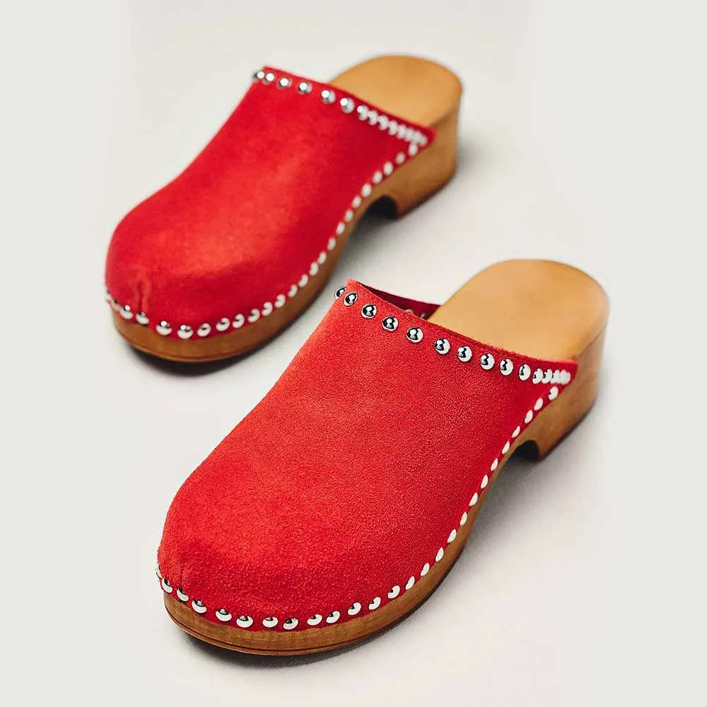 Red Chunky Heel Slip On Platform Studded Mule Shoes for Women