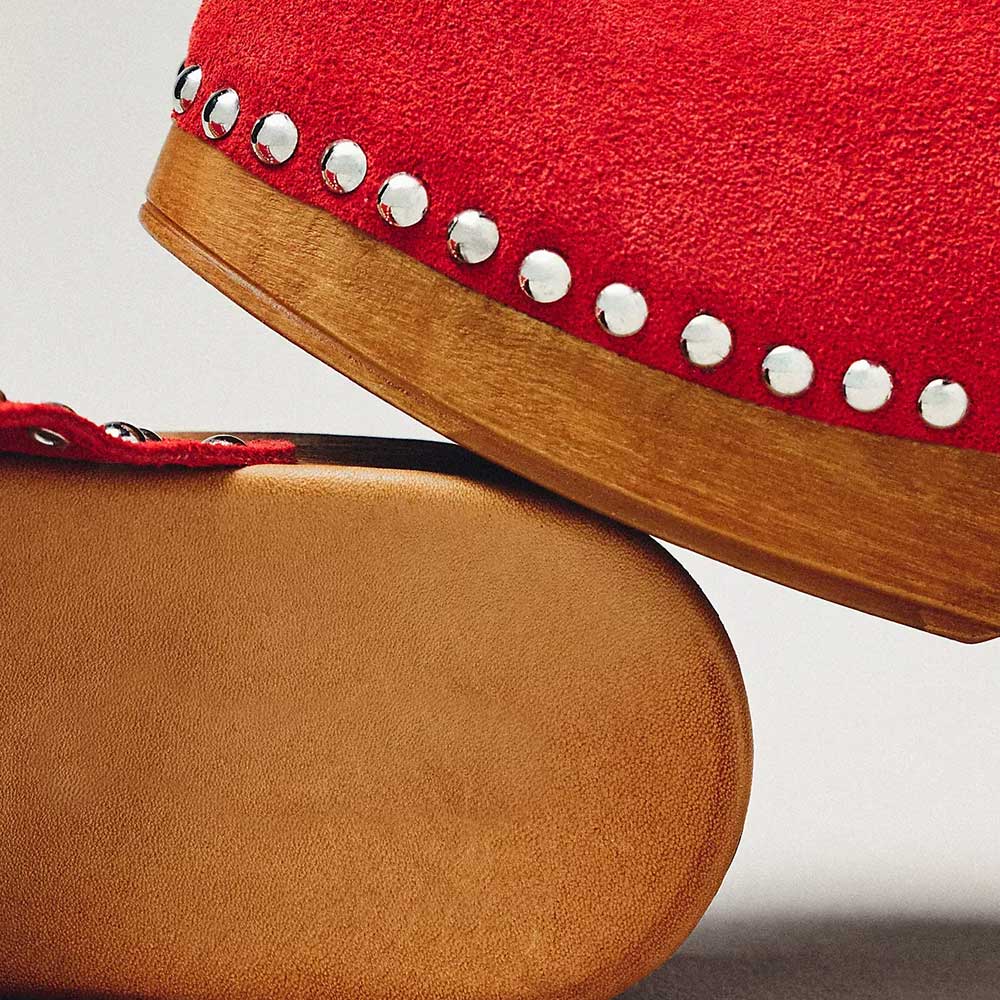 Special Designs: The round-toe platform mules feature chunky heels and stud embellishment.