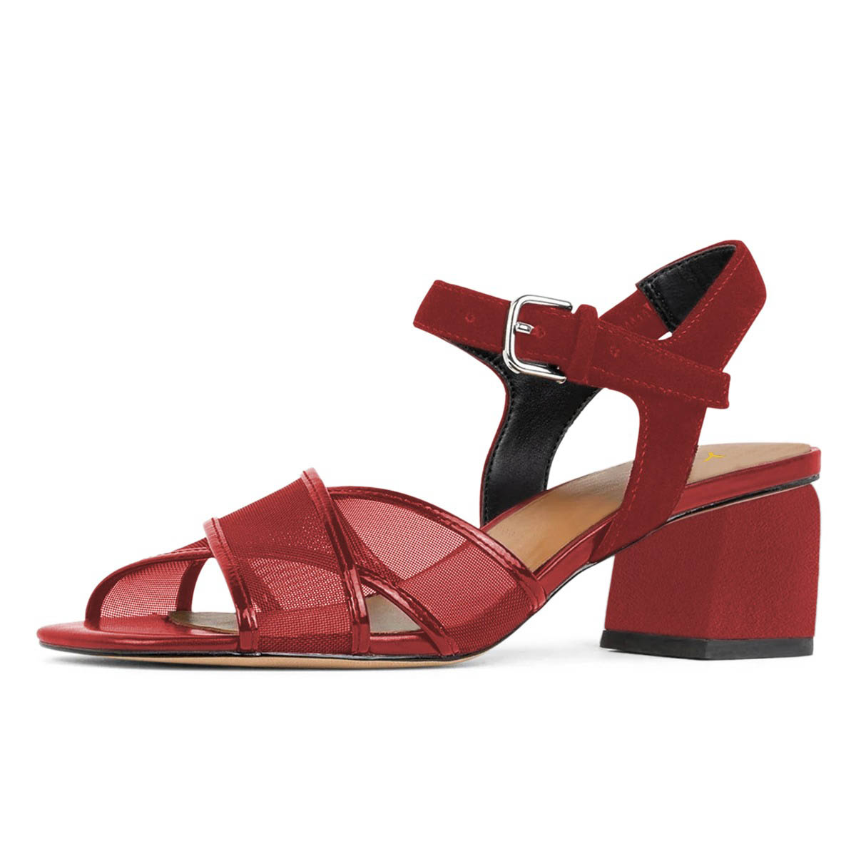 Red Mesh Patchwork Ankle Strap Open Square Toe Women's Heel Sandals