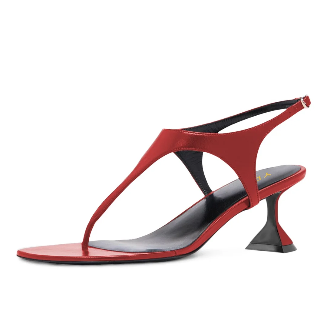 Red Open Toe T-Strap Flip-Flop Style Flared Heeled Sandals