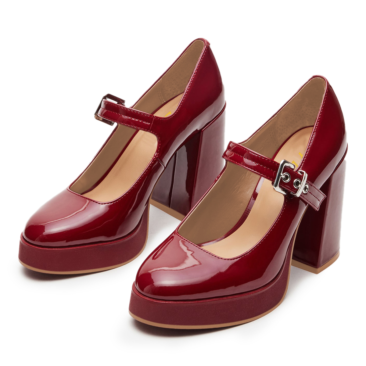• Special Designs: Red Mary Janes with a classic block heel and an adjustable strap design.