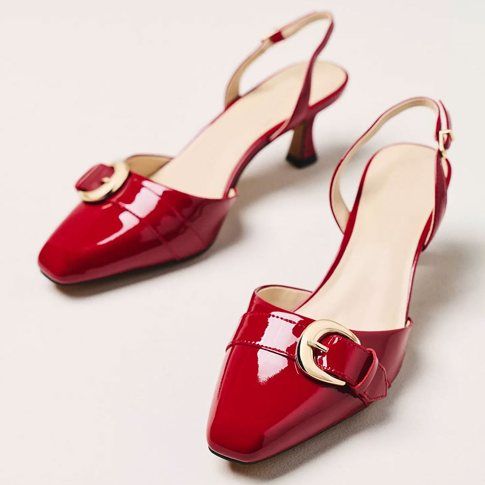 Special Designs: The red slingback pumps feature a pointed toe, a kitten heel, and a decorative gold buckle.