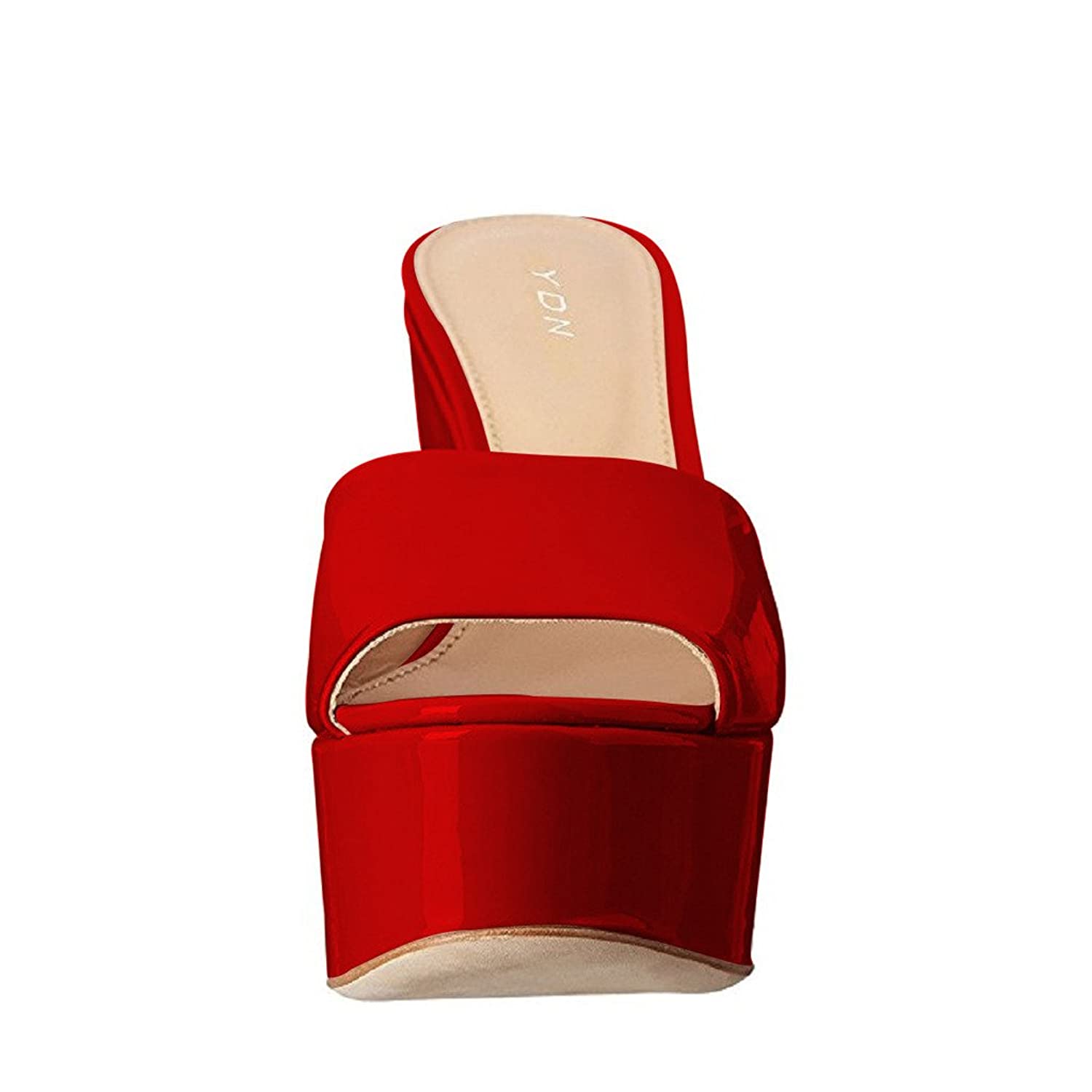 Red Patent Leather Round Toe Wide Band Platform Mules with Wedge Heel