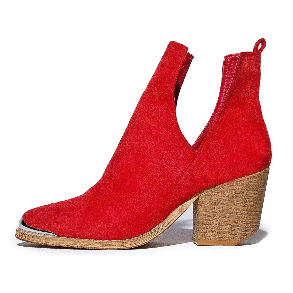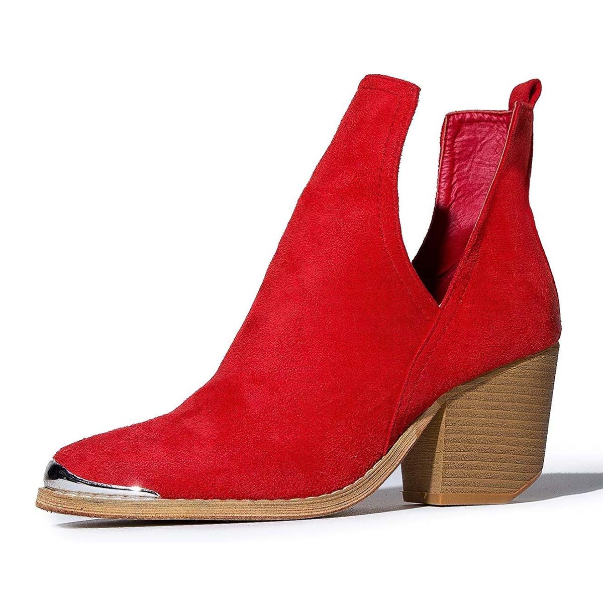 Red Pointed Toe Chunky Heel Cut Out Ankle Boots for Women with Metal