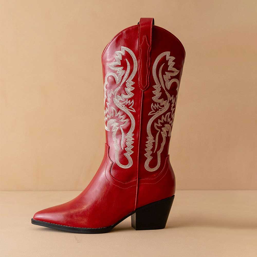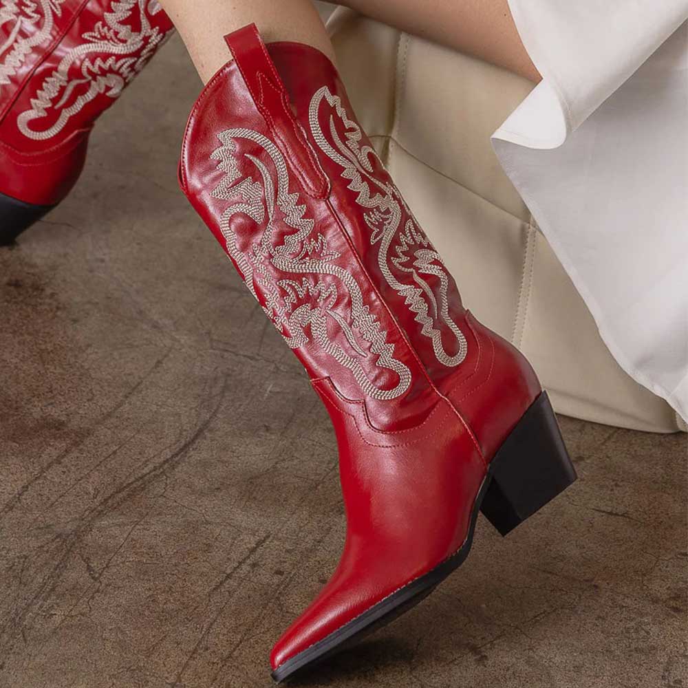 • Special Designs: These red cowgirl boots showcase a pointed toe and chunky heel, beautifully accented with intricate white embroidery that adds a touch of classic Western charm.