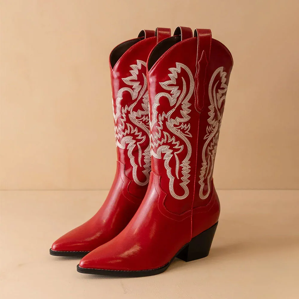 Red Pointed Toe Chunky Heel Pull On Embroidered Cowboy Boots for Women