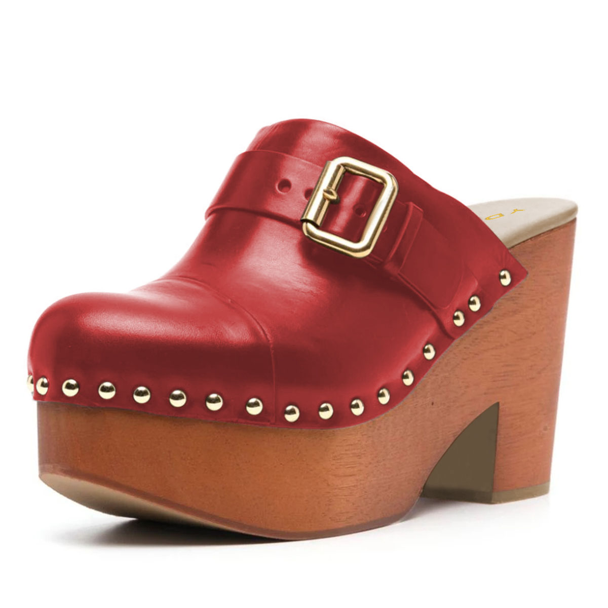 Red Pull-On Studs Buckle Strap Block Heel Platform Mules for Women