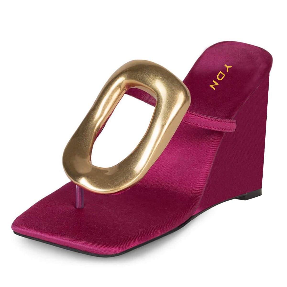 Fuchsia Satin Square Toe Gold Buckle Sandals with Wedge Heels