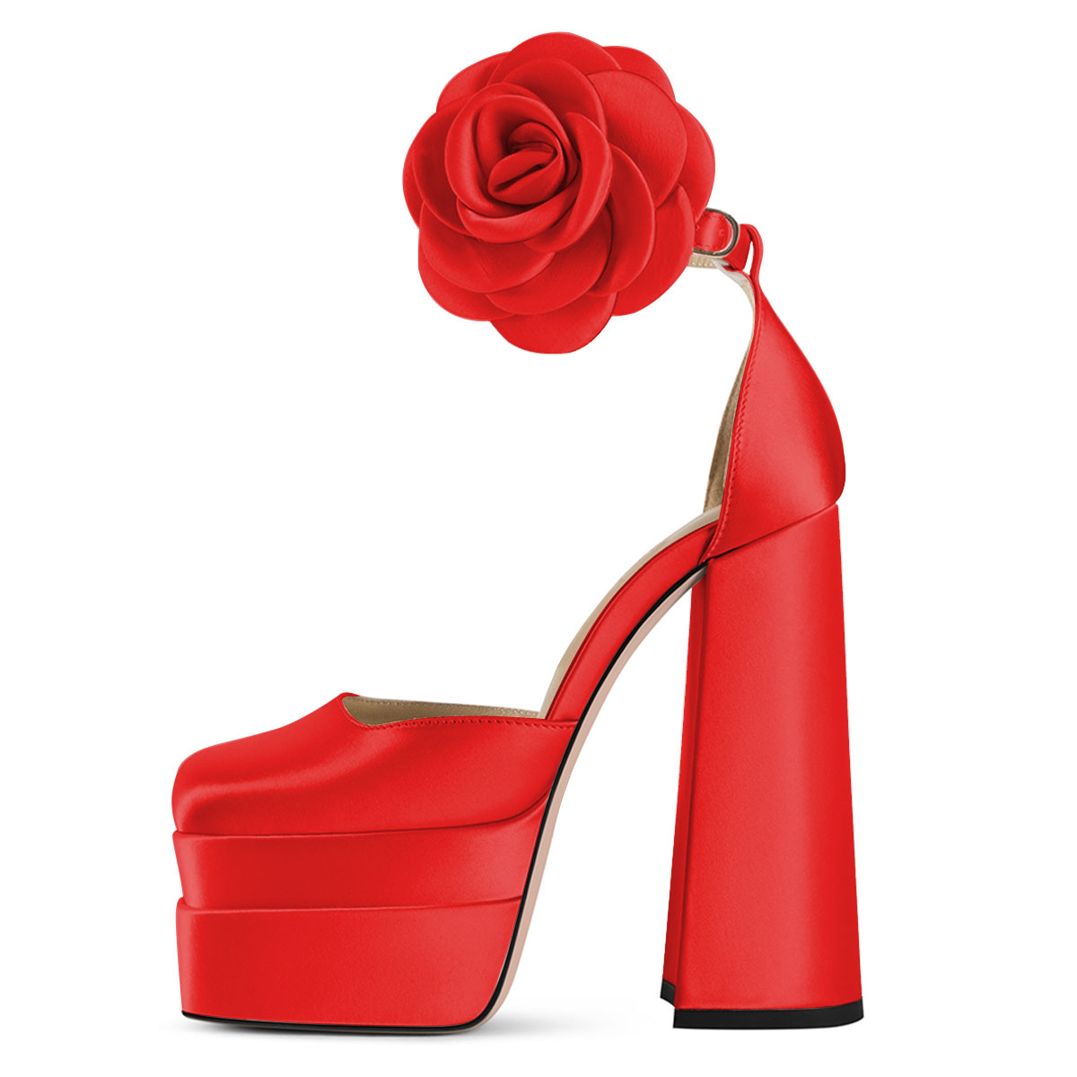 Red Satin Square Toe Platform Flower Decor Ankle Strap 6-Inch Heels