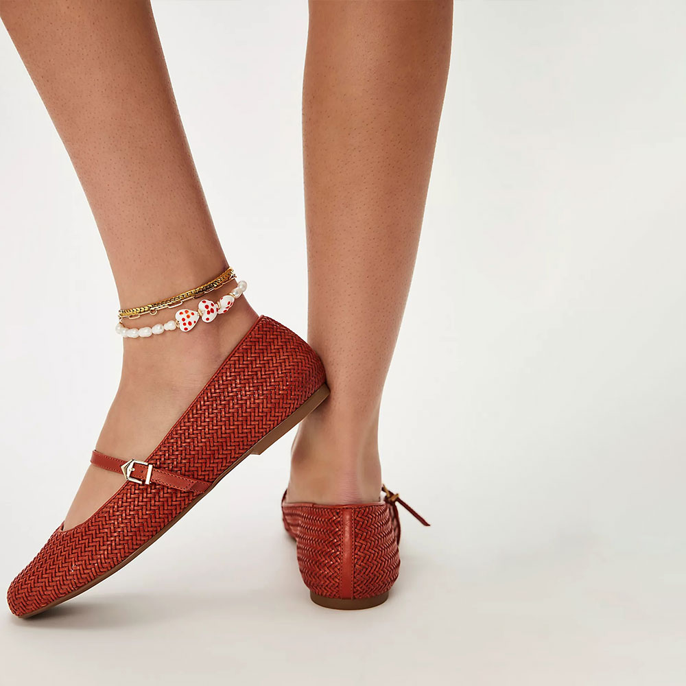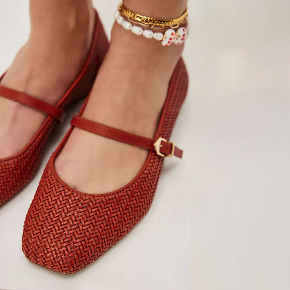 Red Square Toe Woven Detail Buckle Strap Flat Shoes for Women