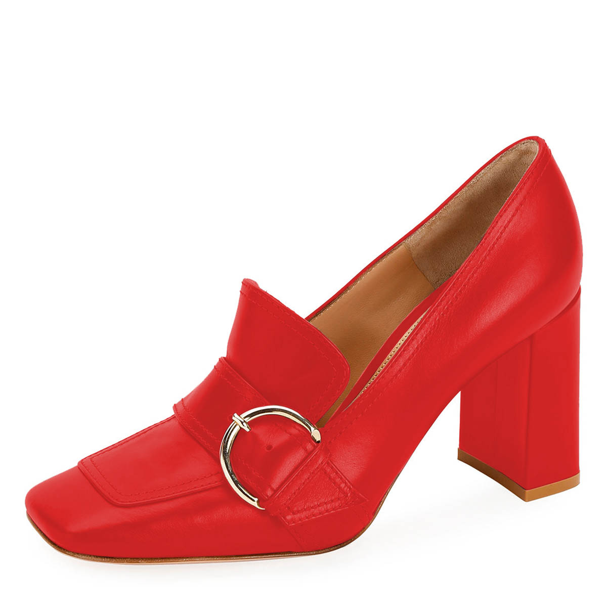 Red Vegan Leather Chunky Heel Buckle Strap Square Toe Women's Loafers