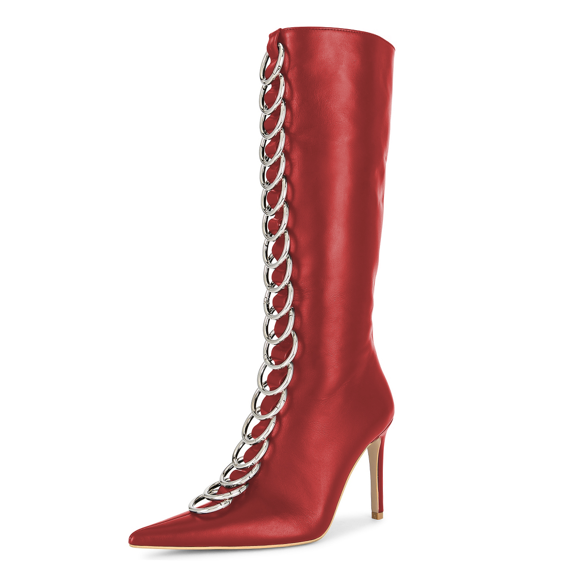 Red Vegan Leather Pointed Multiple Silver Ring Decor Knee High Boots