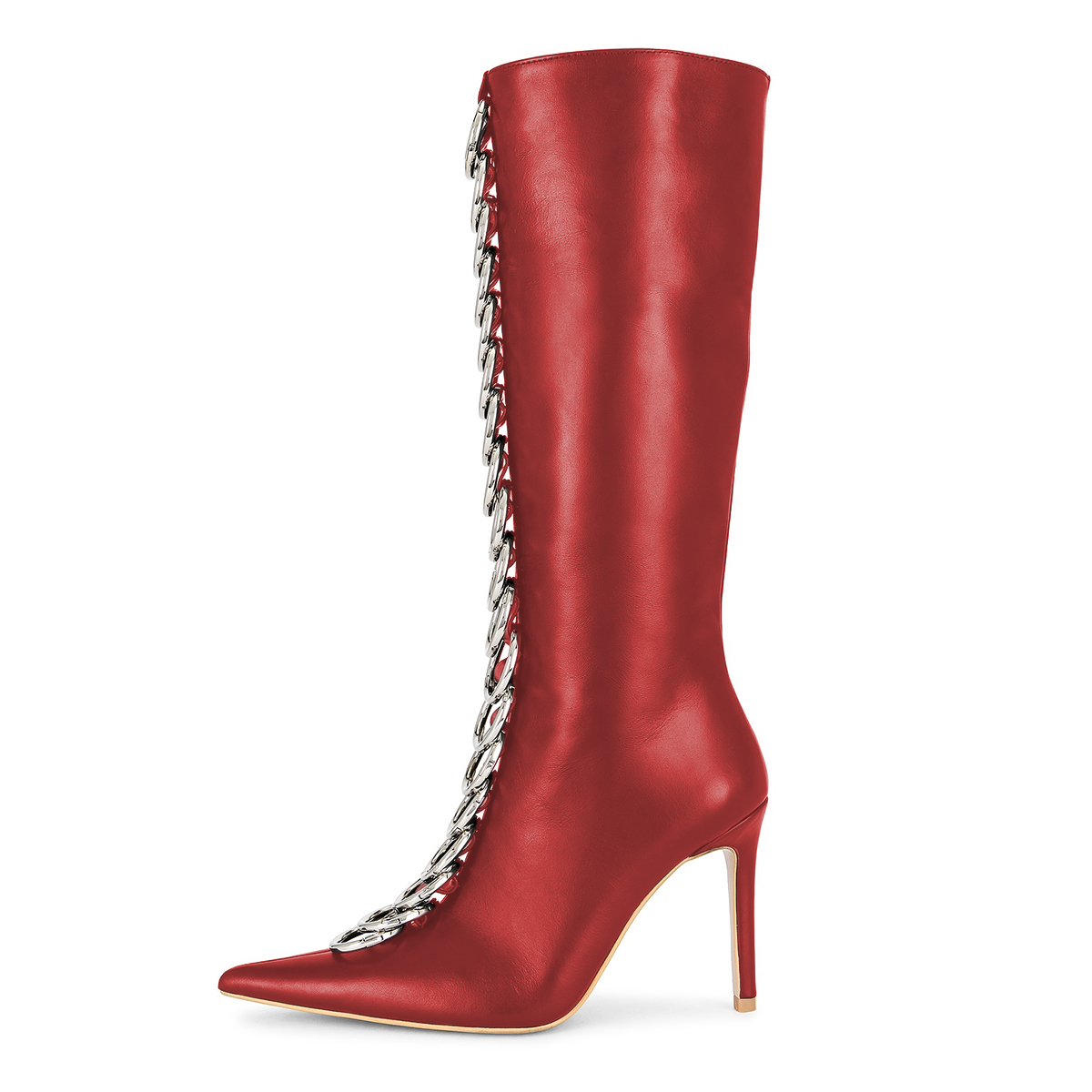• Special Designs: Red knee-high boots featuring multiple silver ring inlay and side-zip closure