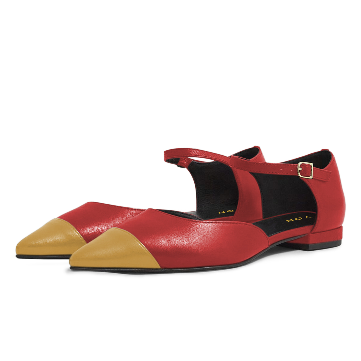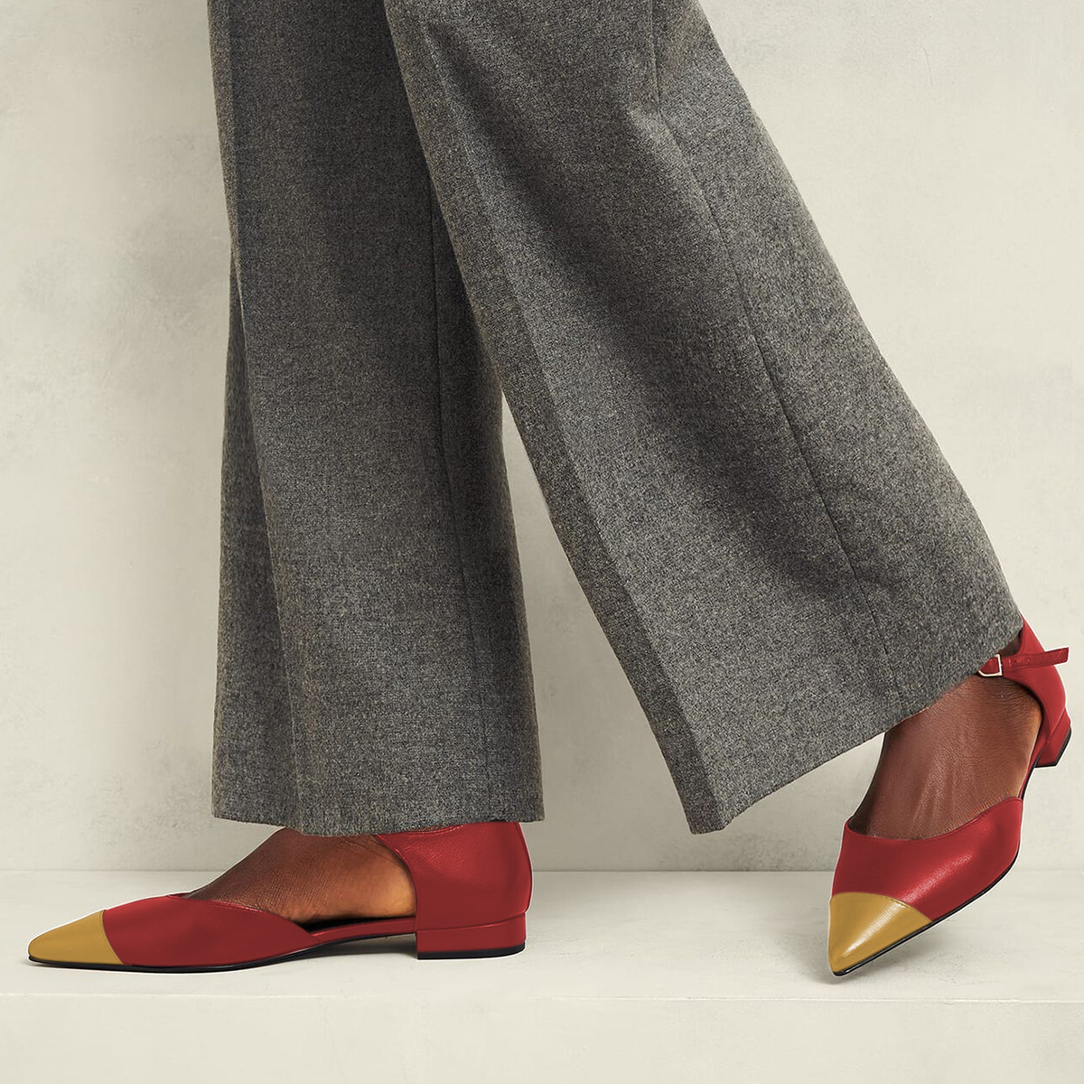 Red Vegan Leather Yellow Pointed Toe Buckle Strap Flat Pumps