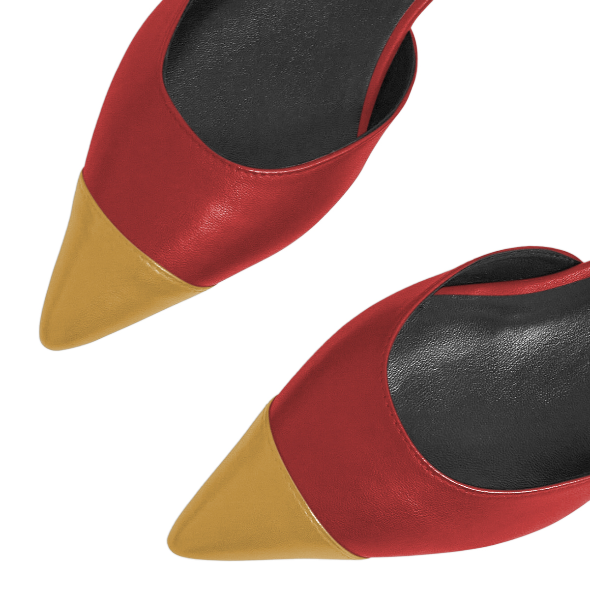 Special Designs: Red pumps with a stylish yellow pointed toe and buckle fastening strap design