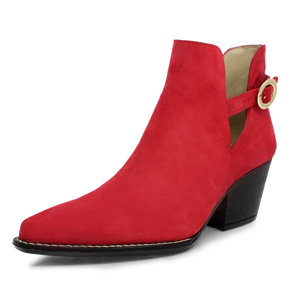 Red Vegan Suede Buckle Strap Chunky Heel Cut-Out Booties for Women