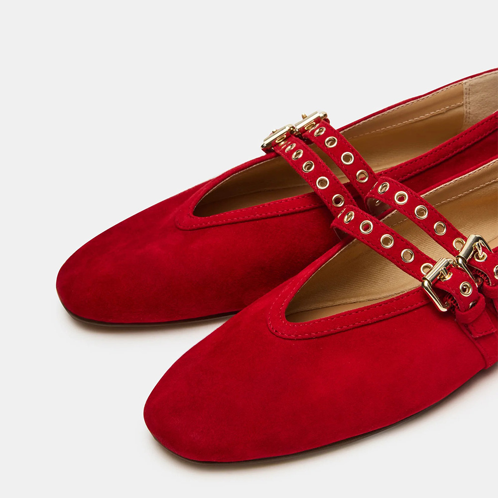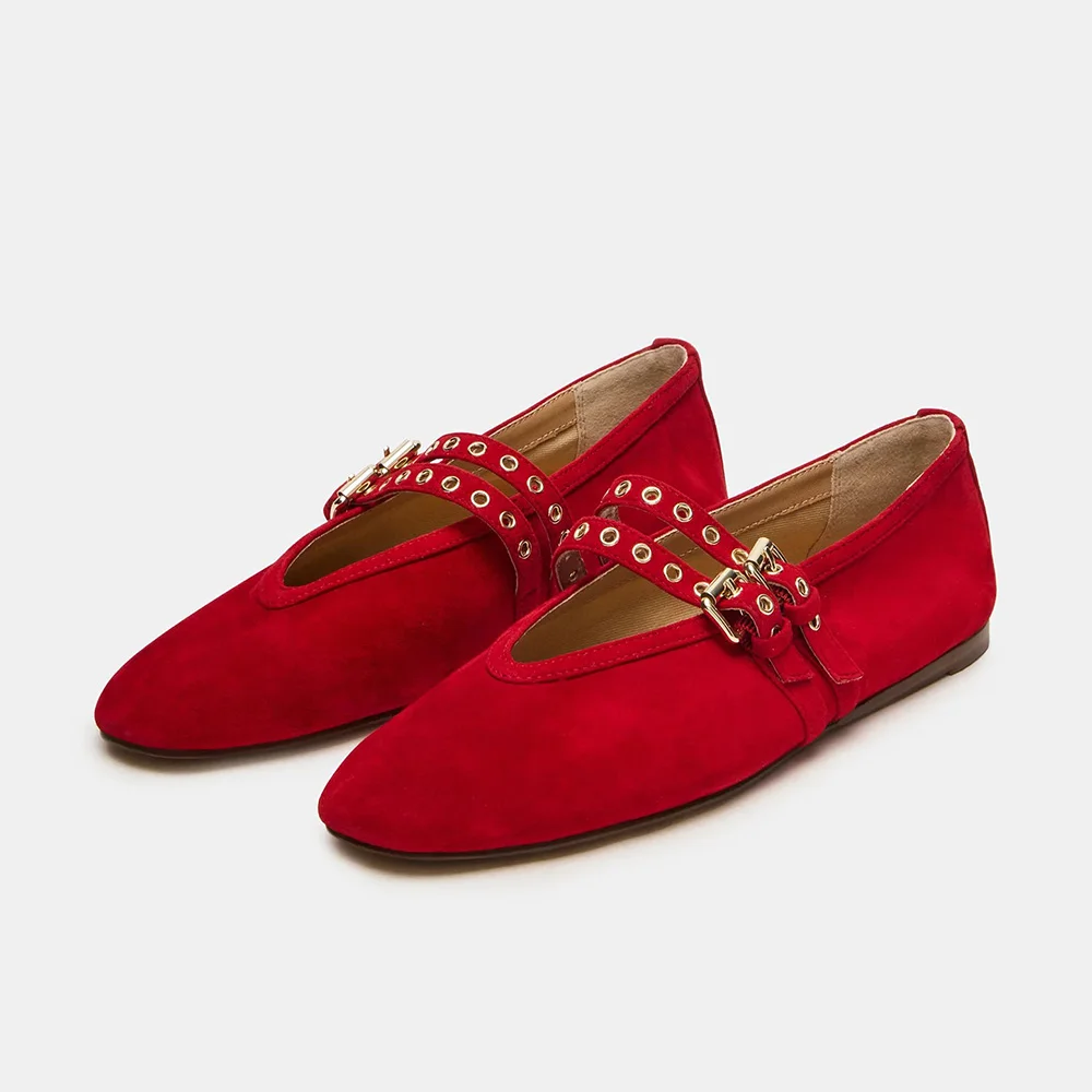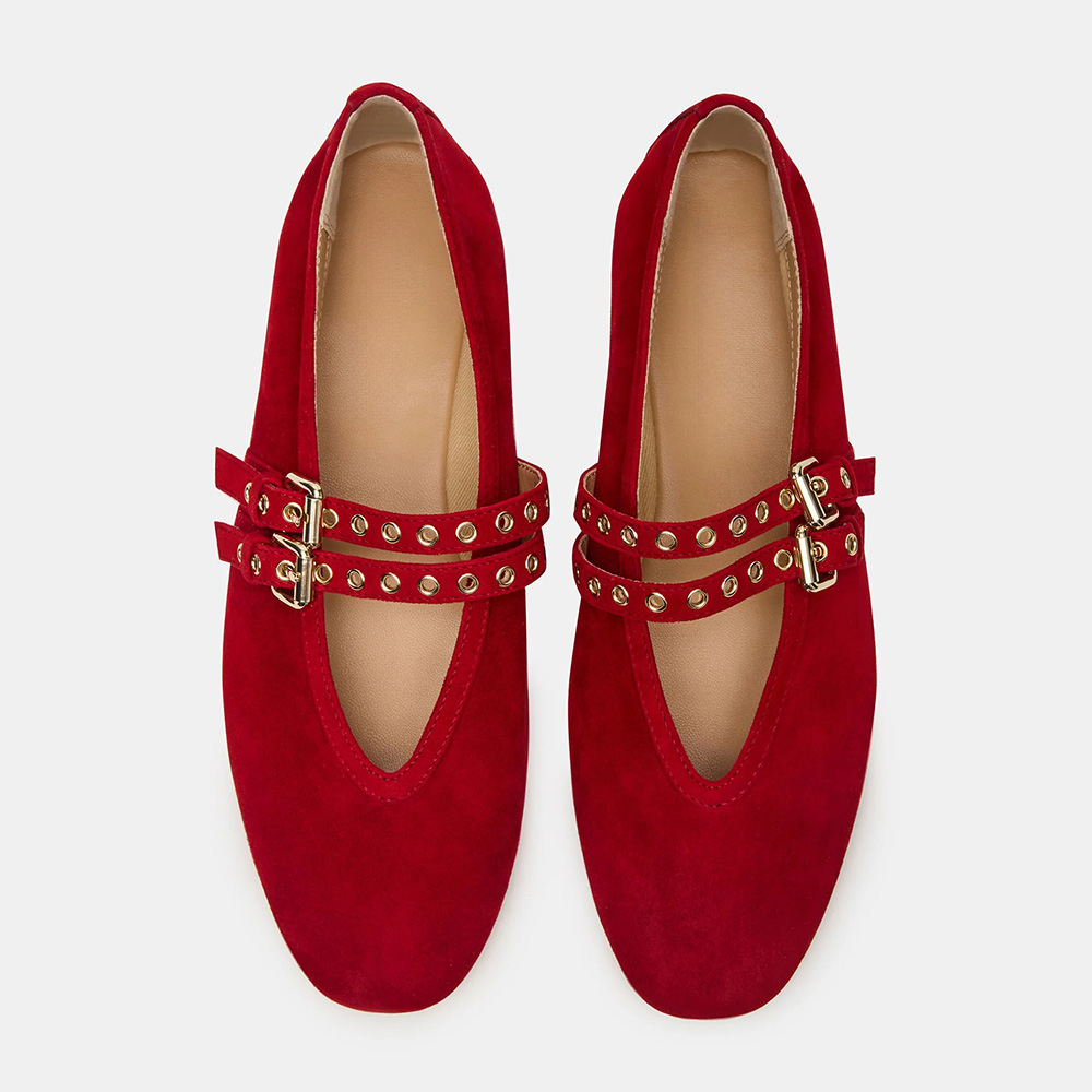 Red Vegan Suede Round Toe Buckle Ballet Mary Jane Flats with Grommet
